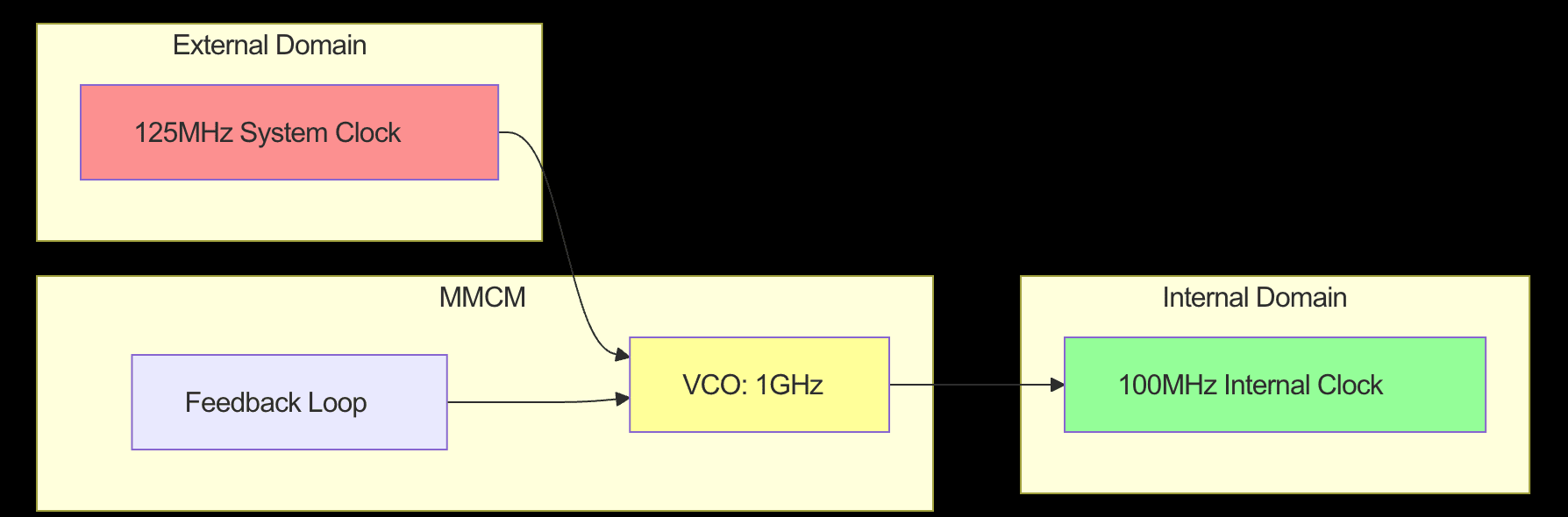 The clock subsystem converts the 125MHz system clock to a 100MHz internal clock: