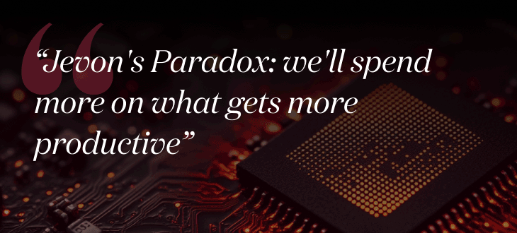 This is a funny juxtaposition. Each of these phenomena have a name: there’s Jevons Paradox, which means, “We’ll spend more on what gets more productive”, and there’s the Baumol Effect, which means, “We’ll spend more on what doesn’t get more productive.” And both of them are top of mind right now, as we watch in awe at what is happening with AI Capex spend.