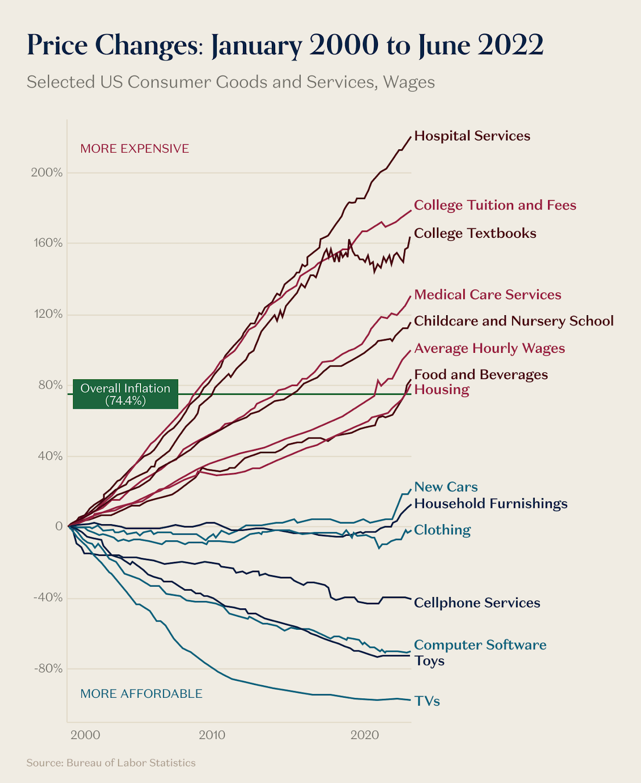 If you live in the United States today, and you accidentally knock a hole in your wall, it’s probably cheaper to buy a flatscreen TV and stick it in front of the hole, compared to hiring a handyman to fix your drywall. (Source: Marc Andreessen.) This seems insane; why?