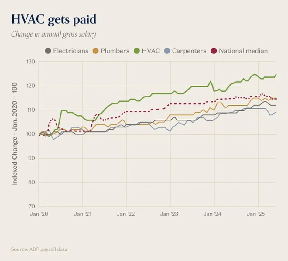 But there’s an interesting spillover effect. The more jobs and opportunities created by the productivity boom, the more wages increase in other industries, who at the end of the day all have to compete in the same labor market. If you can make $30 an hour as a digital freelance marketer (a job that did not exist a generation ago), then you won’t accept less than that from working in food service. And if you can make $150 an hour installing HVAC for data centers, you’re not going to accept less from doing home AC service.