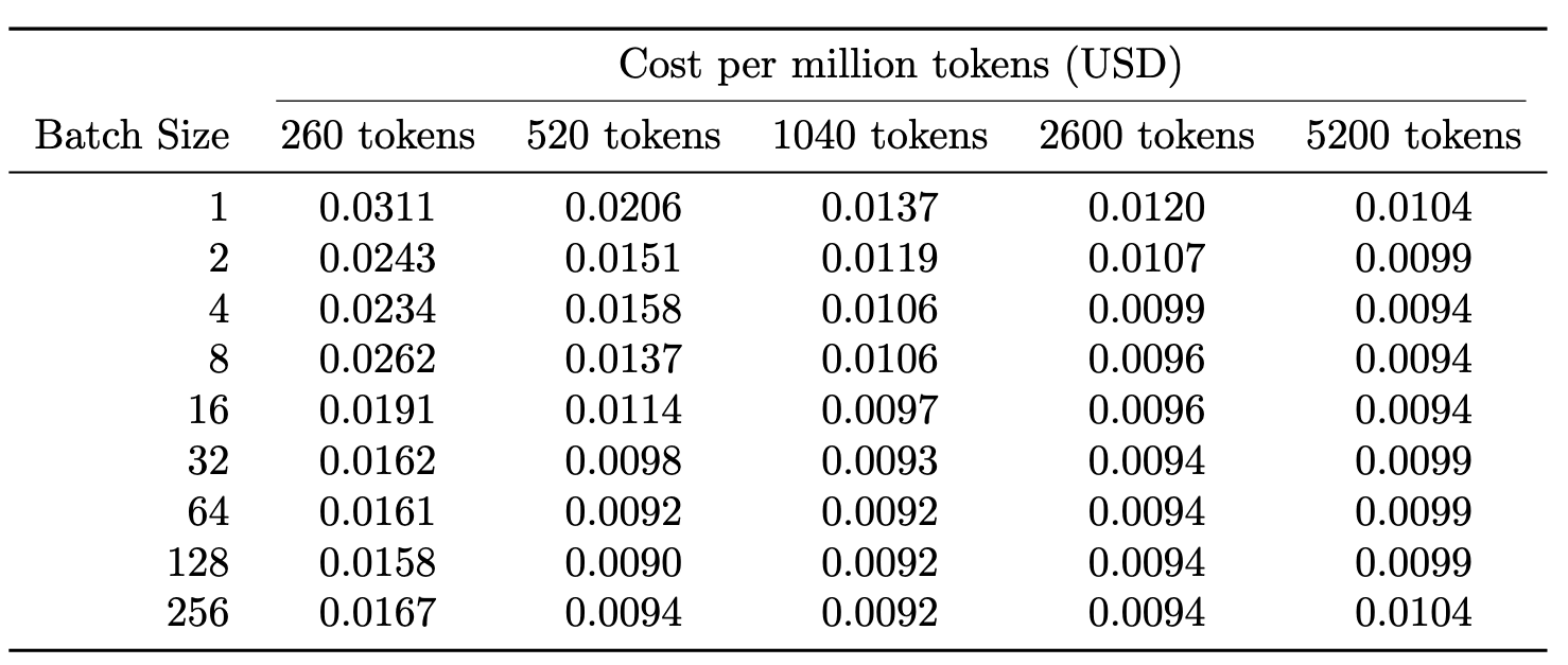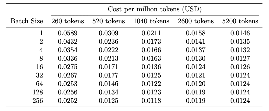 In Tab. 5, we present the estimated pricing for processing 1M input tokens. Once again, please note that this assumes 100% utilization; in practice, you won’t be able to process it so cheaply unless you have some sort of a batching system and massive, not time-sensitive demand that can be spread evenly throughout the day.