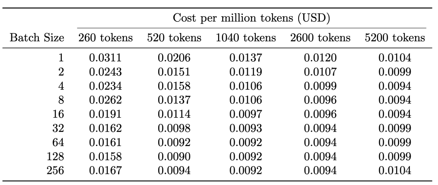 Lastly, based on the observed performance, we calculated the price for processing 1M input tokens for different input-tokens/batch-size setups. Please once again note that the numbers shown assume a situation in which you enjoy 100% utilization, with the request being continuously batched.