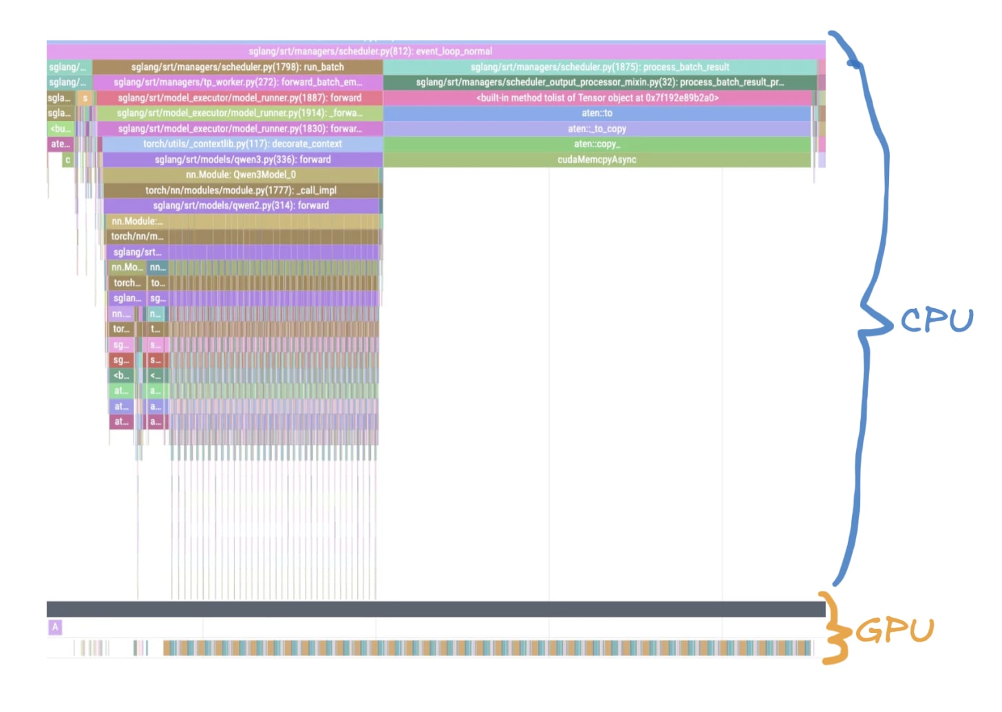 Before diving into our profiling results, it’s important to understand how to read these traces. Torch Profiler shows both CPU and GPU activity in a unified timeline, but they operate asynchronously.