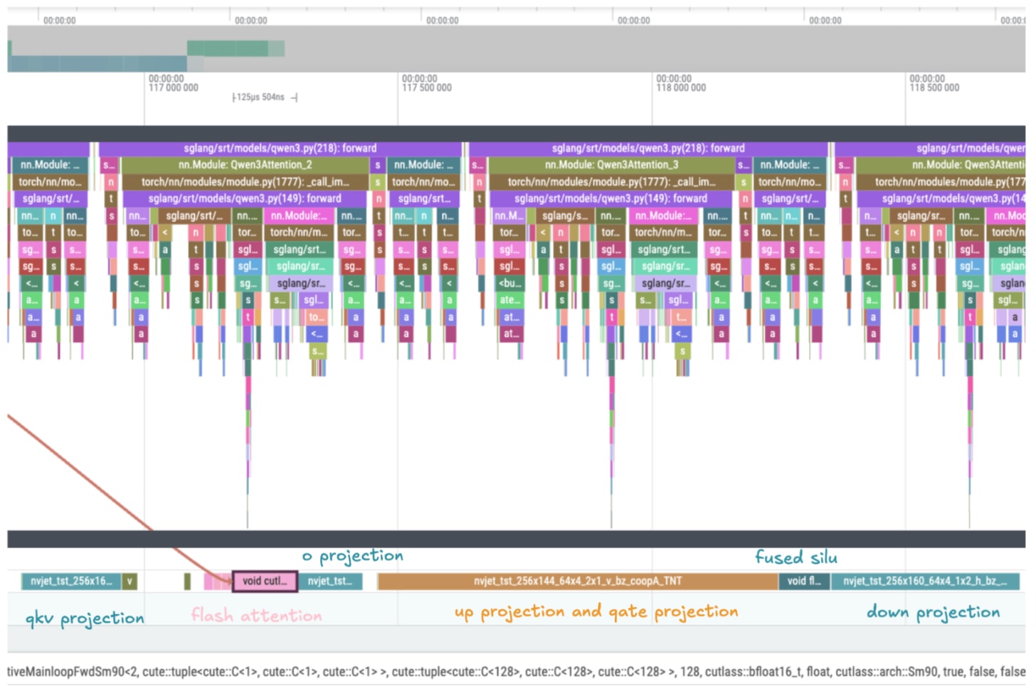 What we calculated while doing the theoretical analysis of the Qwen embedding forward pass, and what we measured via our benchmarking script, can also be observed if we profile the forward pass and look at the individual kernels being invoked. The profile trace can be easily obtained from SGLang by hitting the `start_profile` and `stop_profile` endpoints. All calculations in between these calls will be captured by the torch profiler as demonstrated in Fig. 10.