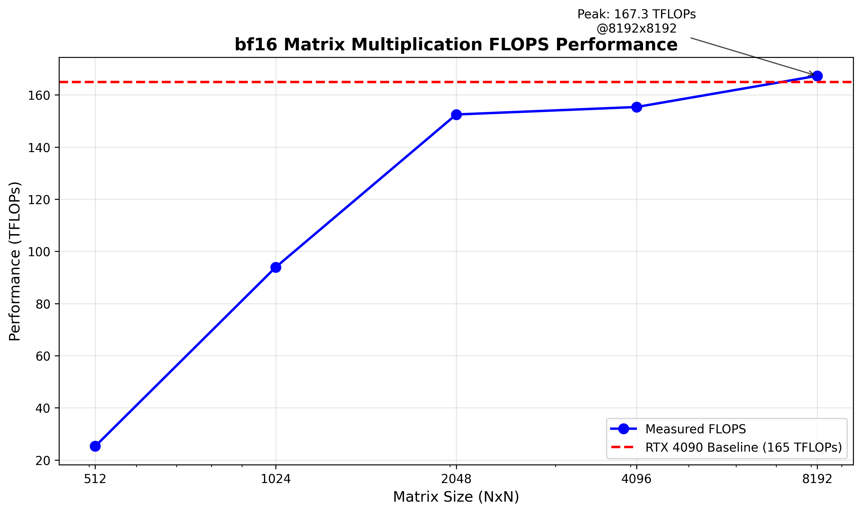 Using the more more realistic 750 TFLOPS (as estimated in Fig. 5), the TFLOPS/$ ratio would drop to 750/2=375, considerably below the RTX 4090's theoretical 445. To verify whether the RTX 4090 can achieve its declared 165 TFLOPS, we ran identical matrix multiplication benchmarks (Fig. 17). The RTX 4090 closely matches NVIDIA's specifications.