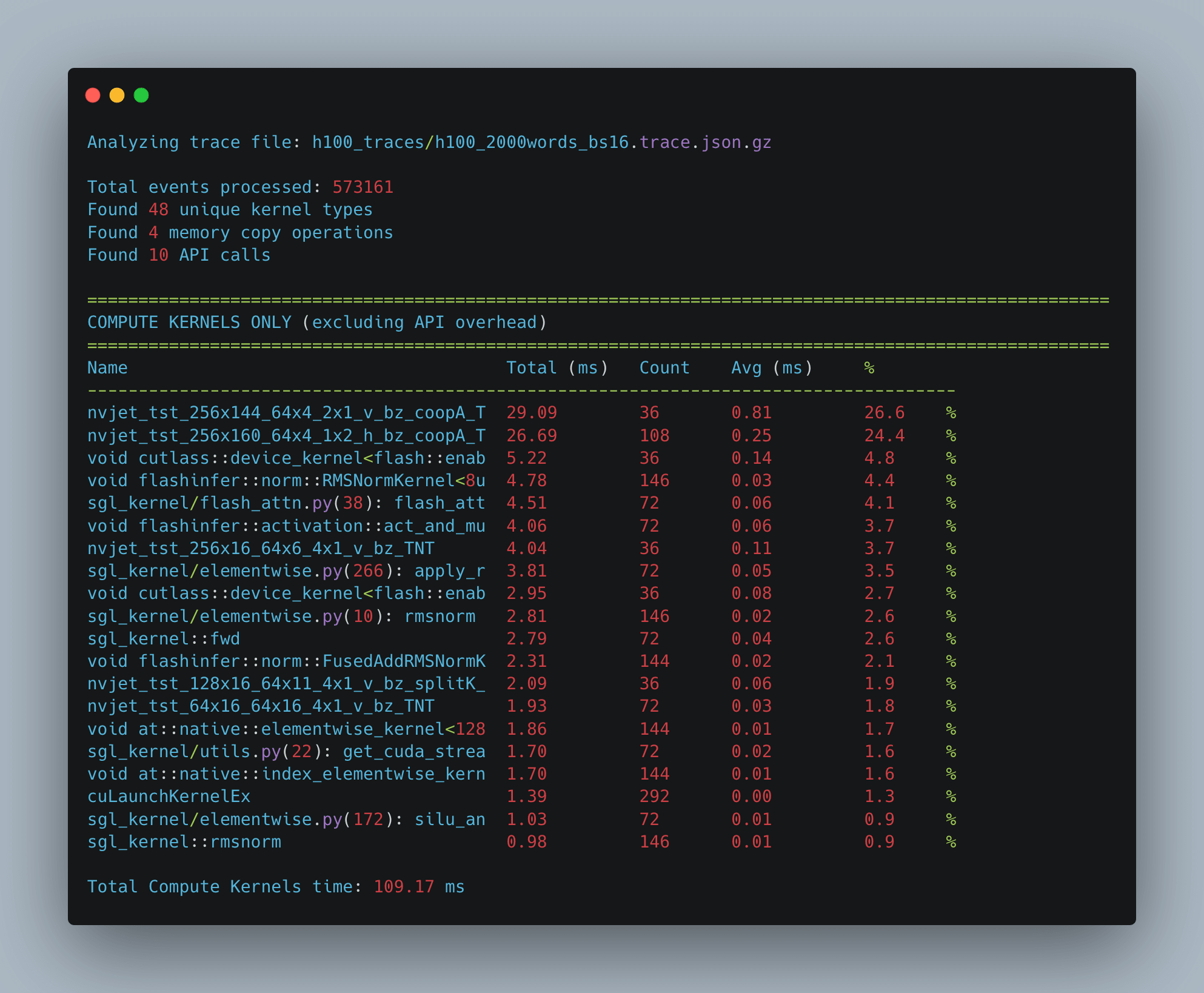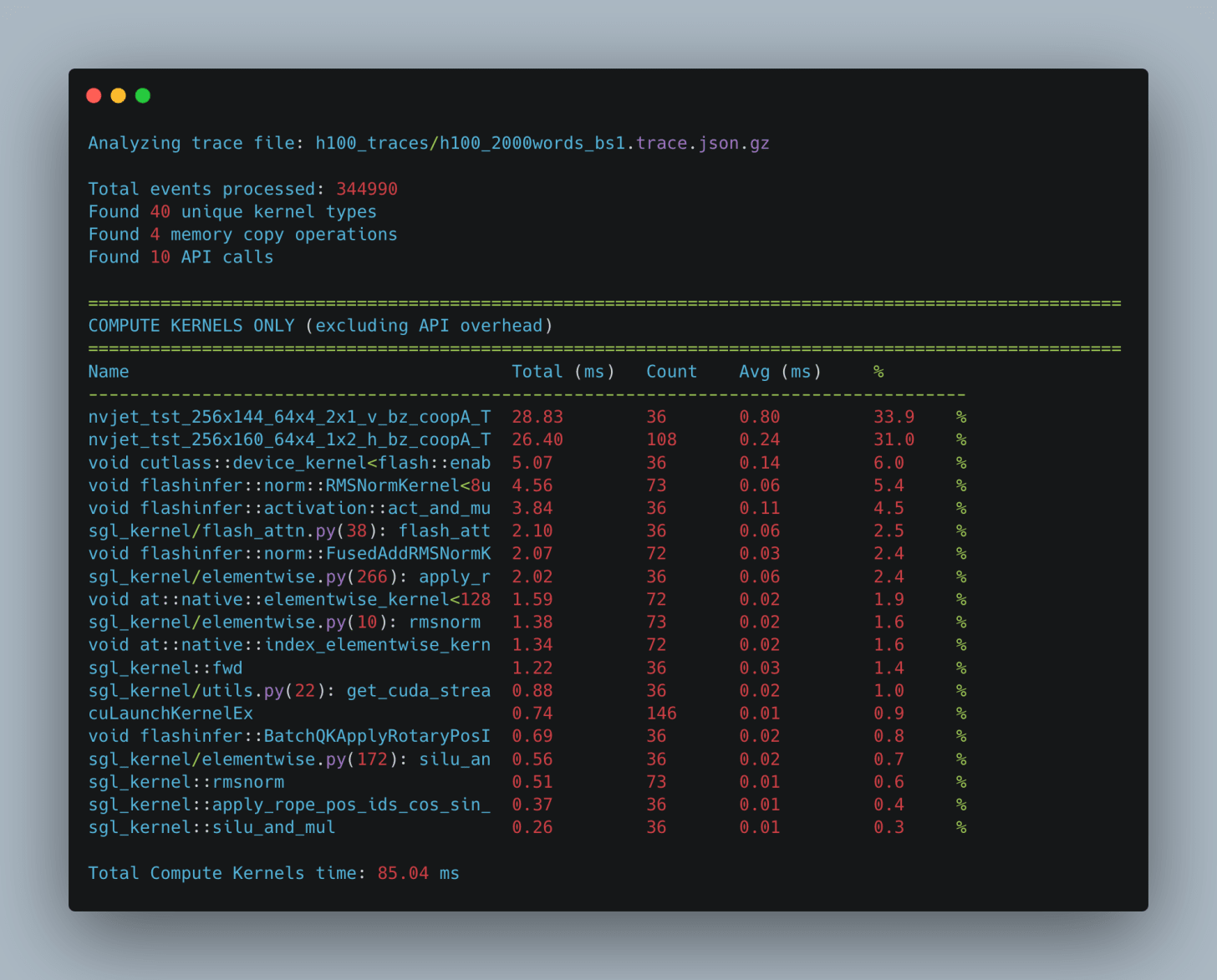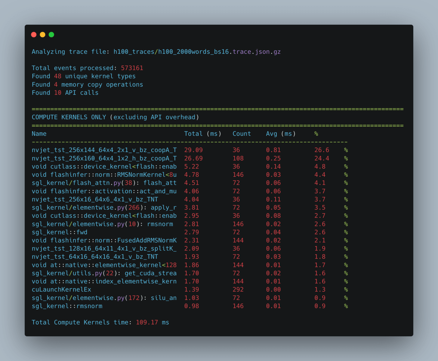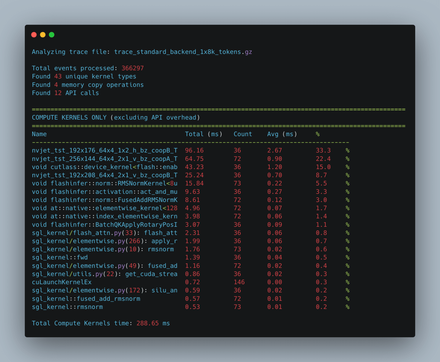 Other kernels like fused SILU and RMS norm (primarily from FlashInfer) contribute smaller percentages of wall time and aren't explored further here.