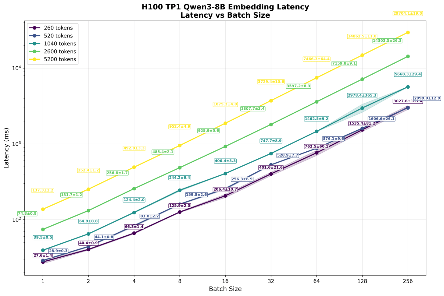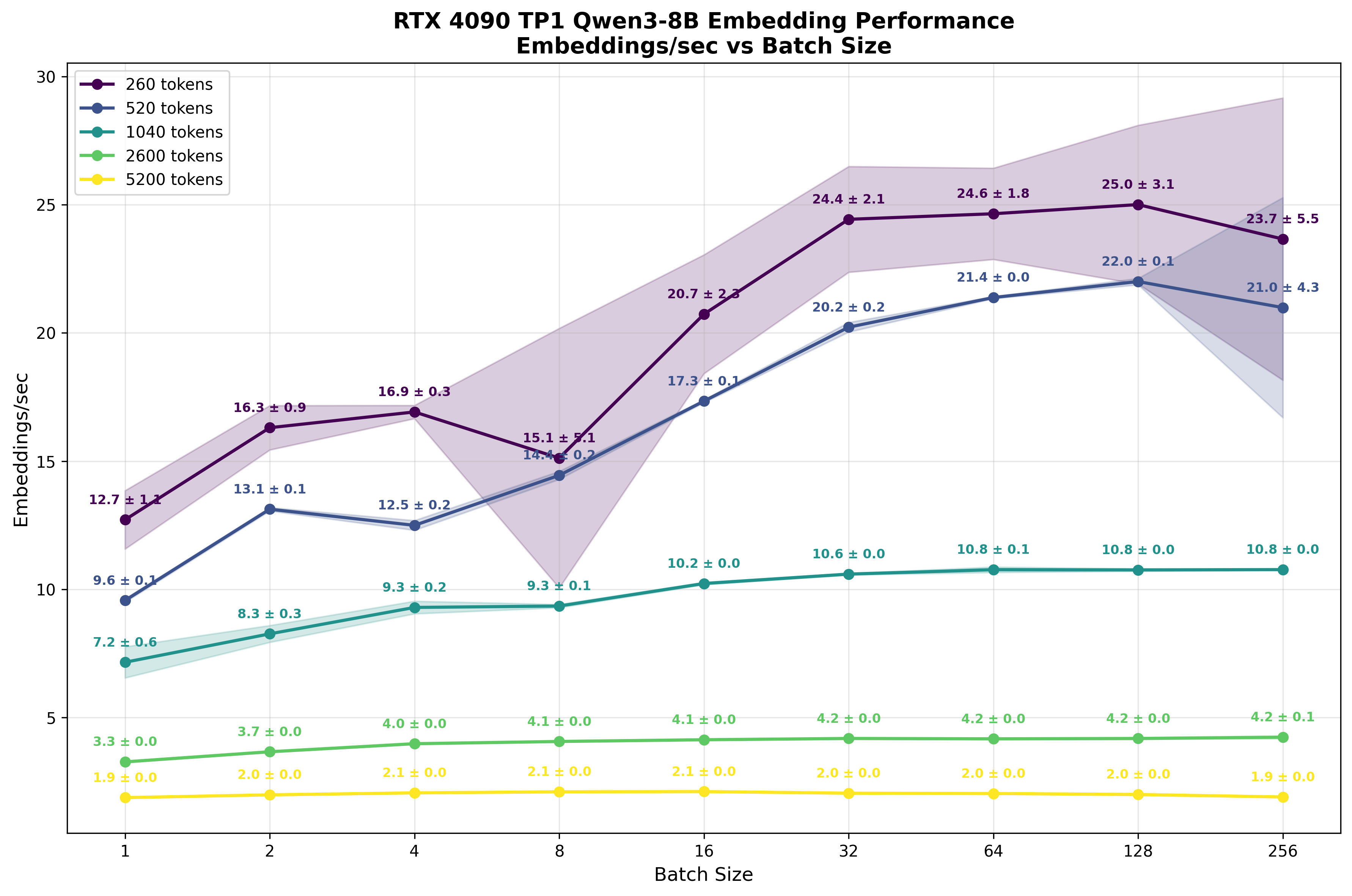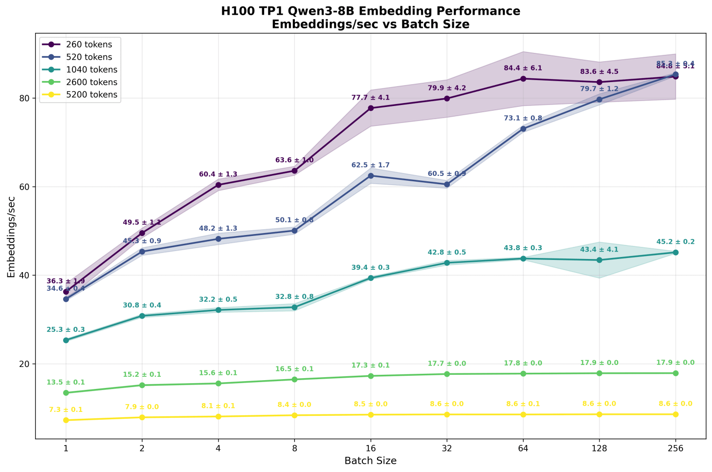 What the reader should immediately spot is how, despite batch size increasing, the number of embeddings processed within a second doesn’t scale significantly. For shorter sequences (260 and 520 tokens), increasing batch size from 1 to 64 yields only ~2.3x improvement in total token throughput. As sequence length increases and compute becomes more saturated, this scaling benefit diminishes ever further. For the longest sequences (5200 tokens), larger batch sizes provide virtually no benefit.