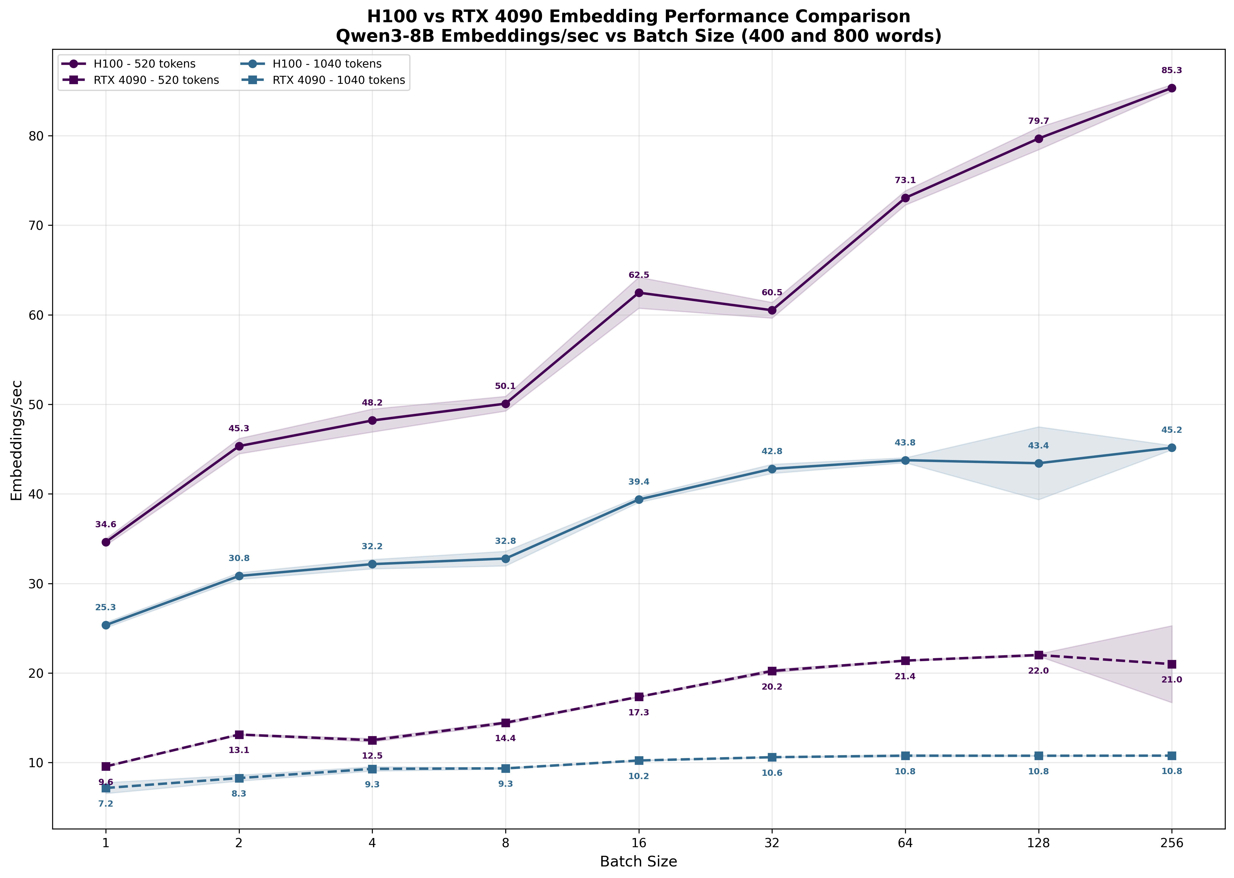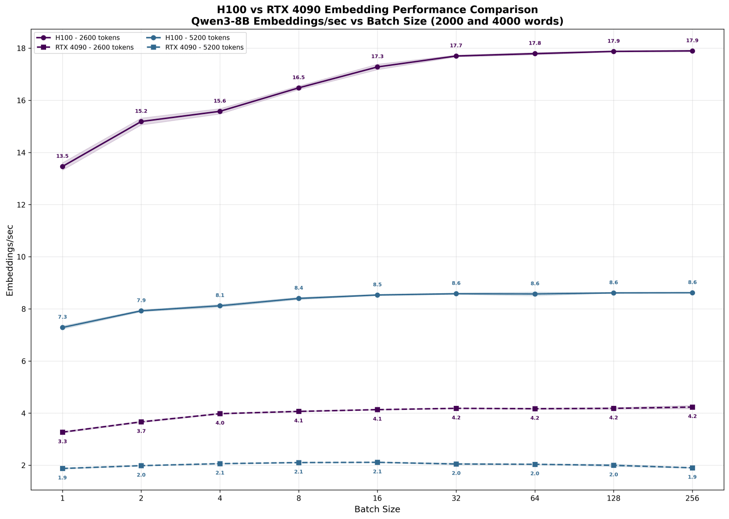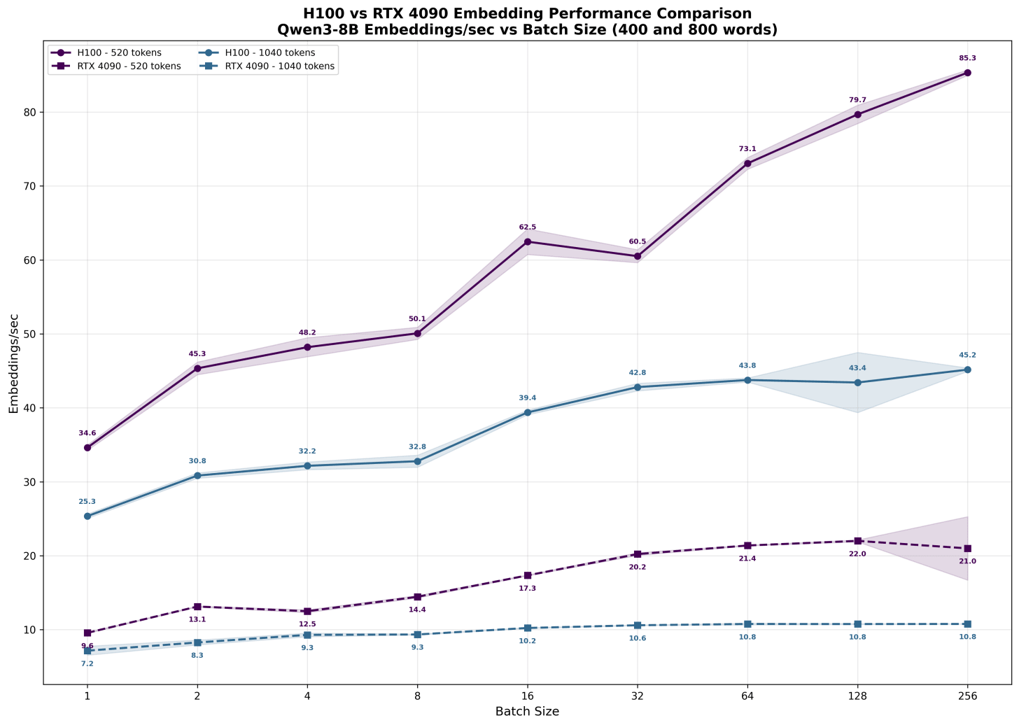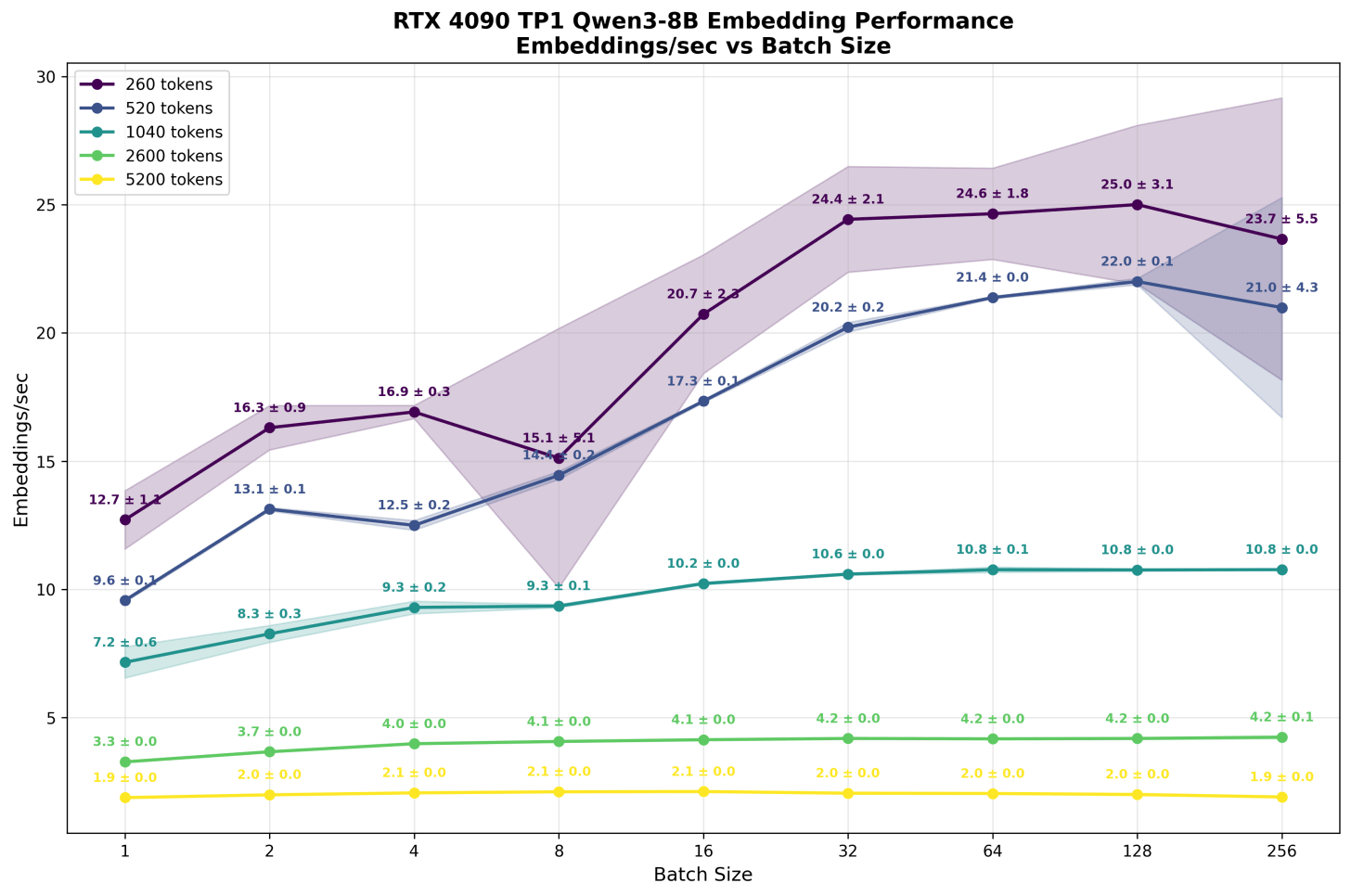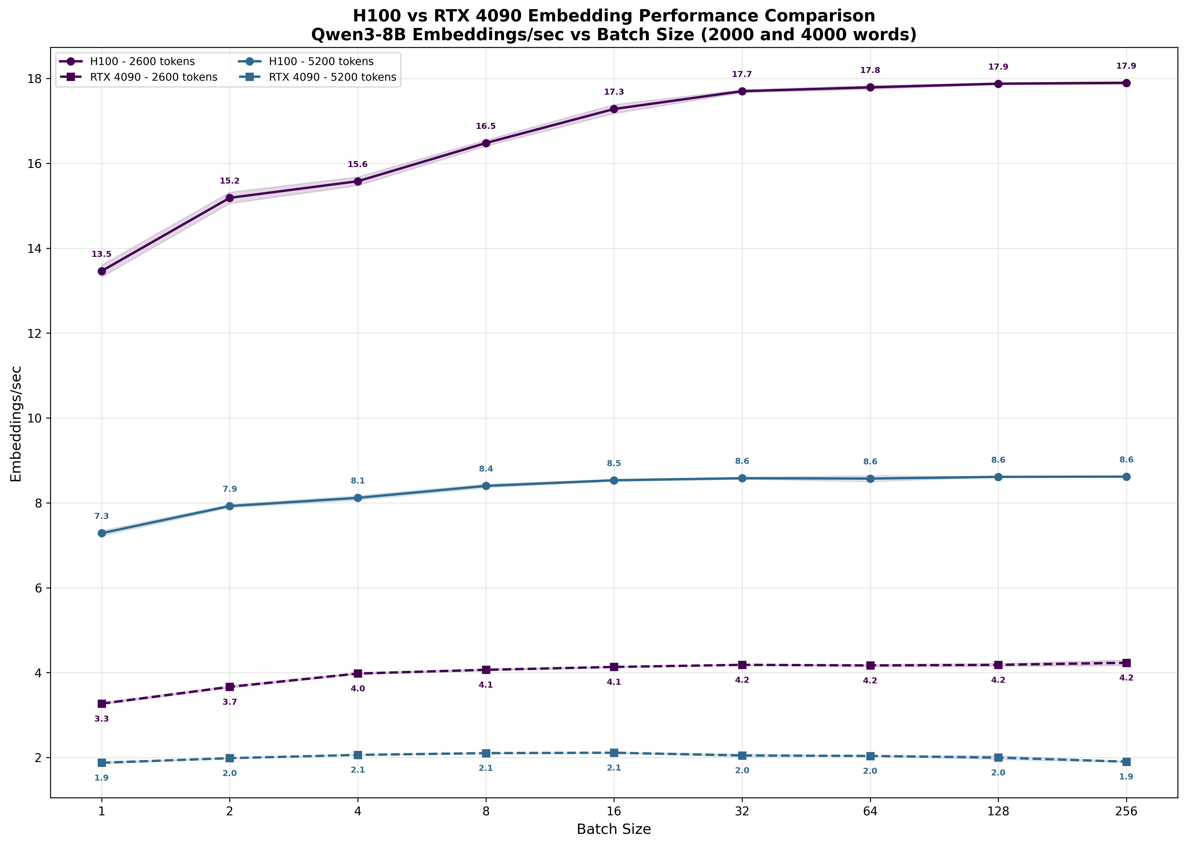 This suggests RTX 4090 should deliver better performance per dollar for embedding generation. Since embedding computation is dominated by large-scale matrix multiplication, this benchmark performance difference should accurately predict real-world embedding throughput differences.