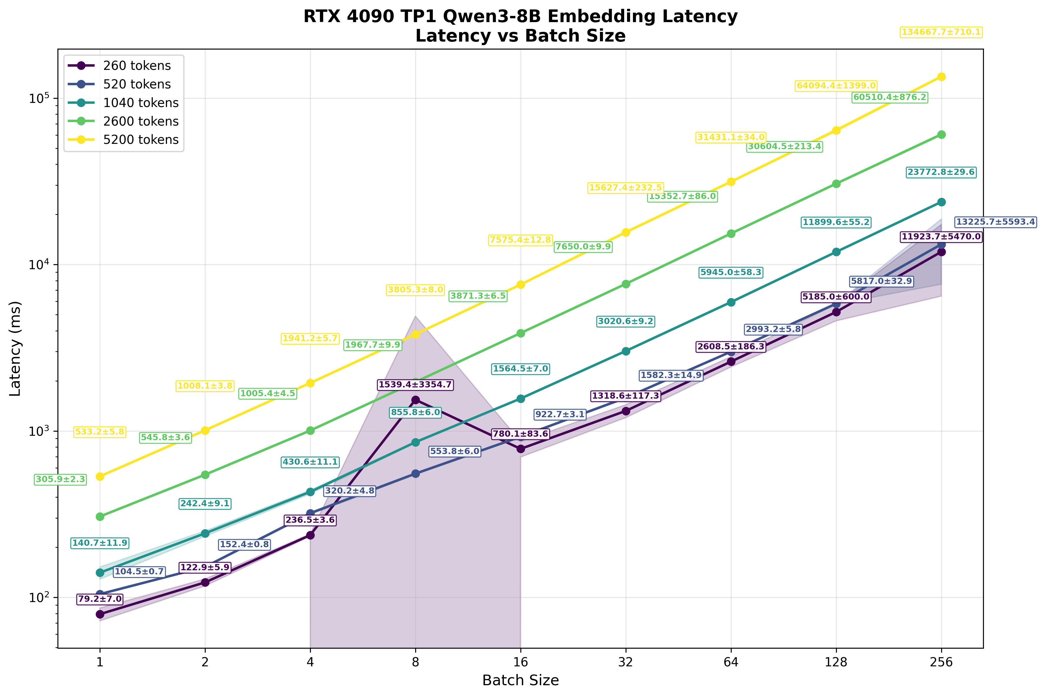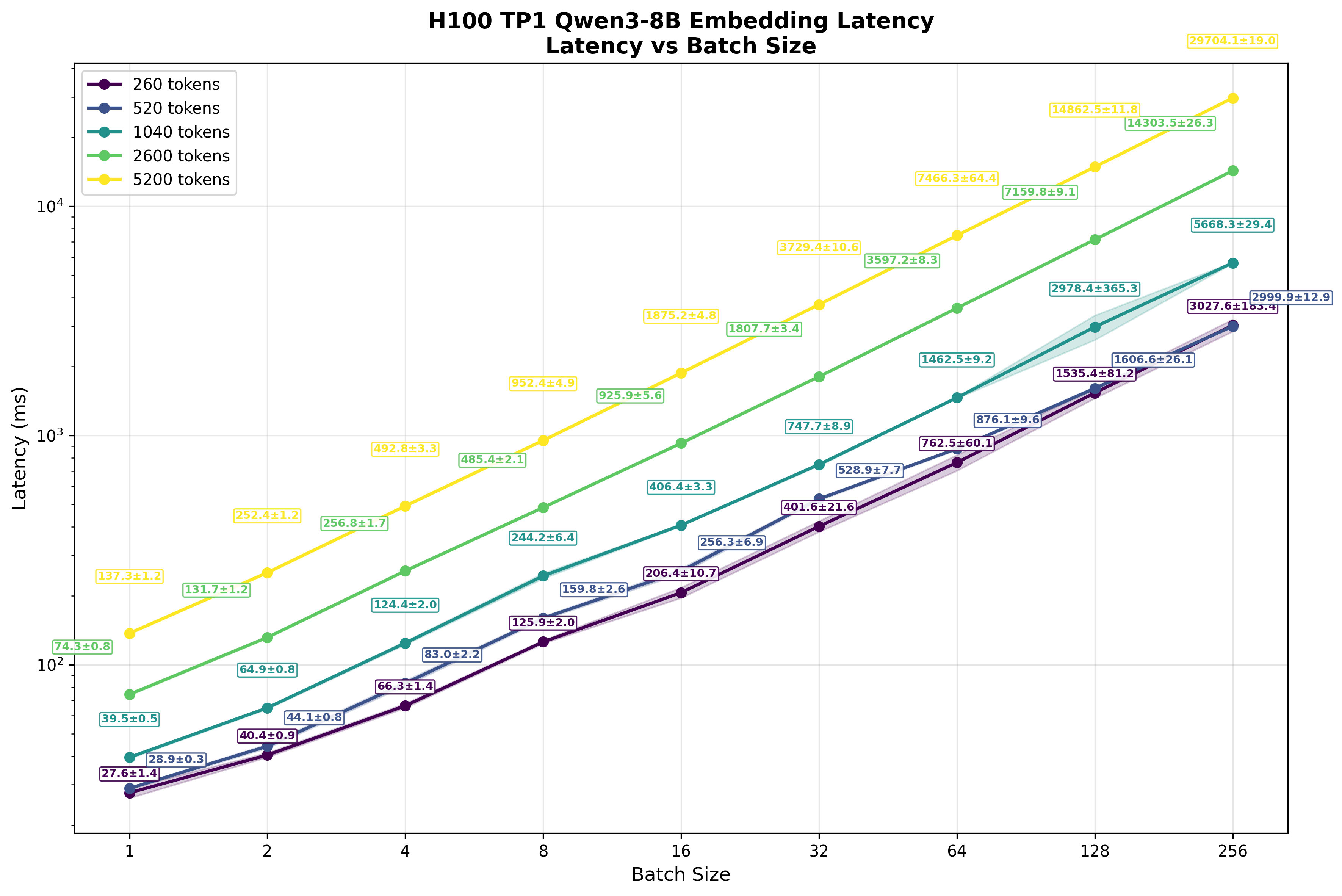 The fundamental difference lies in computational bottlenecks. While autoregressive generation is limited by memory bandwidth and benefits from amortizing memory costs across batches, embeddings face the opposite constraint. Embedding generation requires only a single forward pass, but this pass involves large-scale matrix operations that fully saturate available compute. This is the main intuition we hope the reader takes out of this text. Embeddings are primarily compute bound. Due to this there is only limited benefit to batching, and it comes at the cost of severely increased latency experienced by each individual user. This means that, unlike in serving GPT-style models, there are very limited benefits to scale - running big batches doesn’t slash our cost “per user”. This further decreases the appeal of serving embeddings as a business.