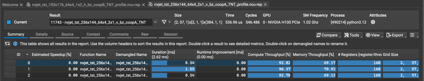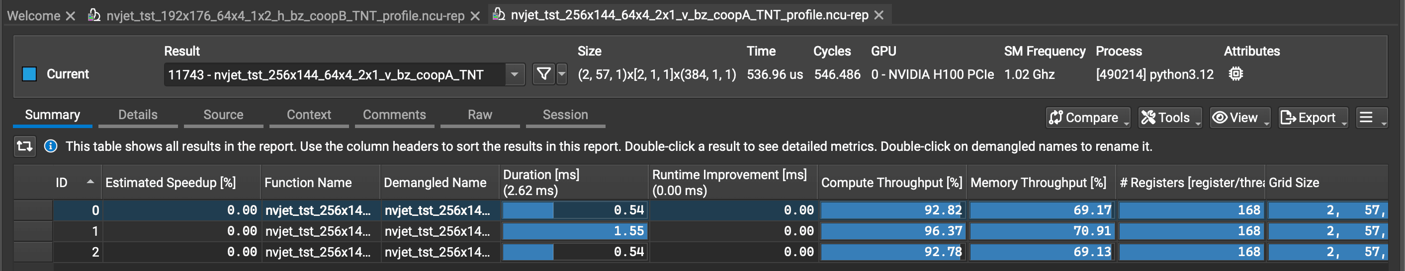 When profiling the kernel with NCU, it becomes pretty evident that we achieve very, very high compute utilization (see Fig. 16). Our compute throughput is pretty close to 100% of utilization. Note how since the majority of time is spent computing, the memory remains underutilized.
