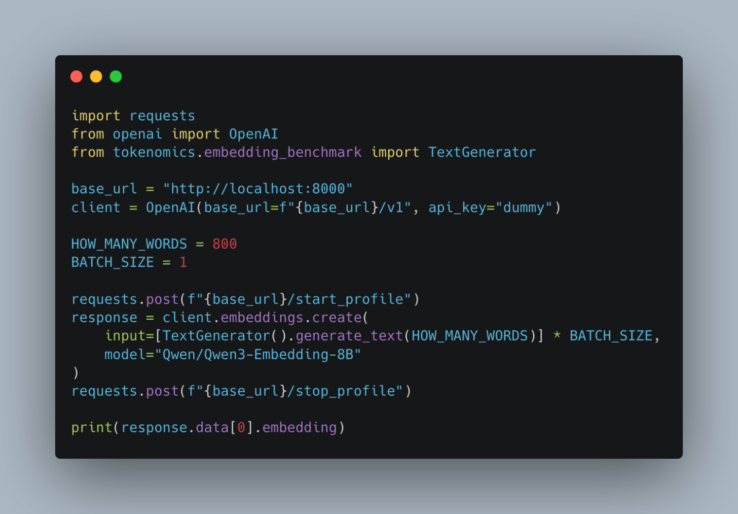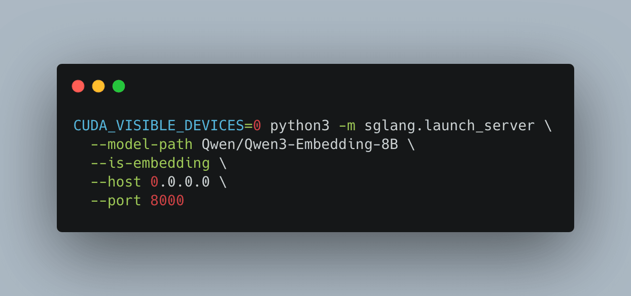 To measure the real-world performance of an embedding model, we can use the popular LLM inference engine - SGLang. Running it is quite simple (see Fig. 6) and should work out of the box on any H100 setup. SGLang provides an efficient inference platform, realized in the form of an OpenAI-compatible endpoint, and should be a good basis for our experiments.