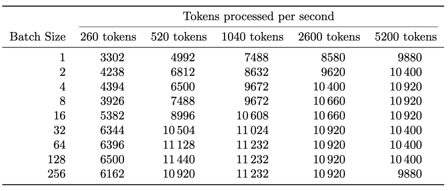 Based on the experiments we captured in Fig. 7, we can quite easily calculate what the total number of tokens processed per second is at different batch sizes at: