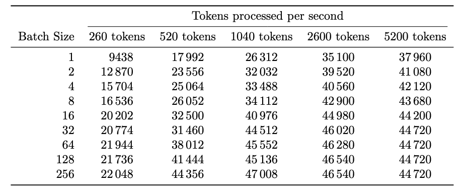 In Tab. 1 we present the number of tokens processed each second based on the numbers presented in Fig. 7. What the reader should note is that the numbers saturate around ~45k tokens/s, which once again shows our calculation getting compute bound.