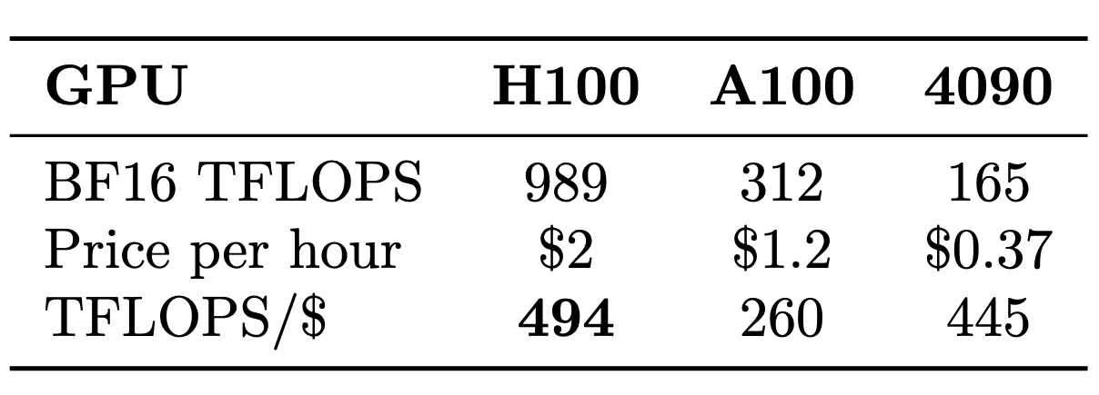 The logical approach is finding GPUs with superior FLOPS/dollar ratios. Table 3 compares three popular options using on-demand cloud pricing: H100 SXM, A100, and RTX 4090.
