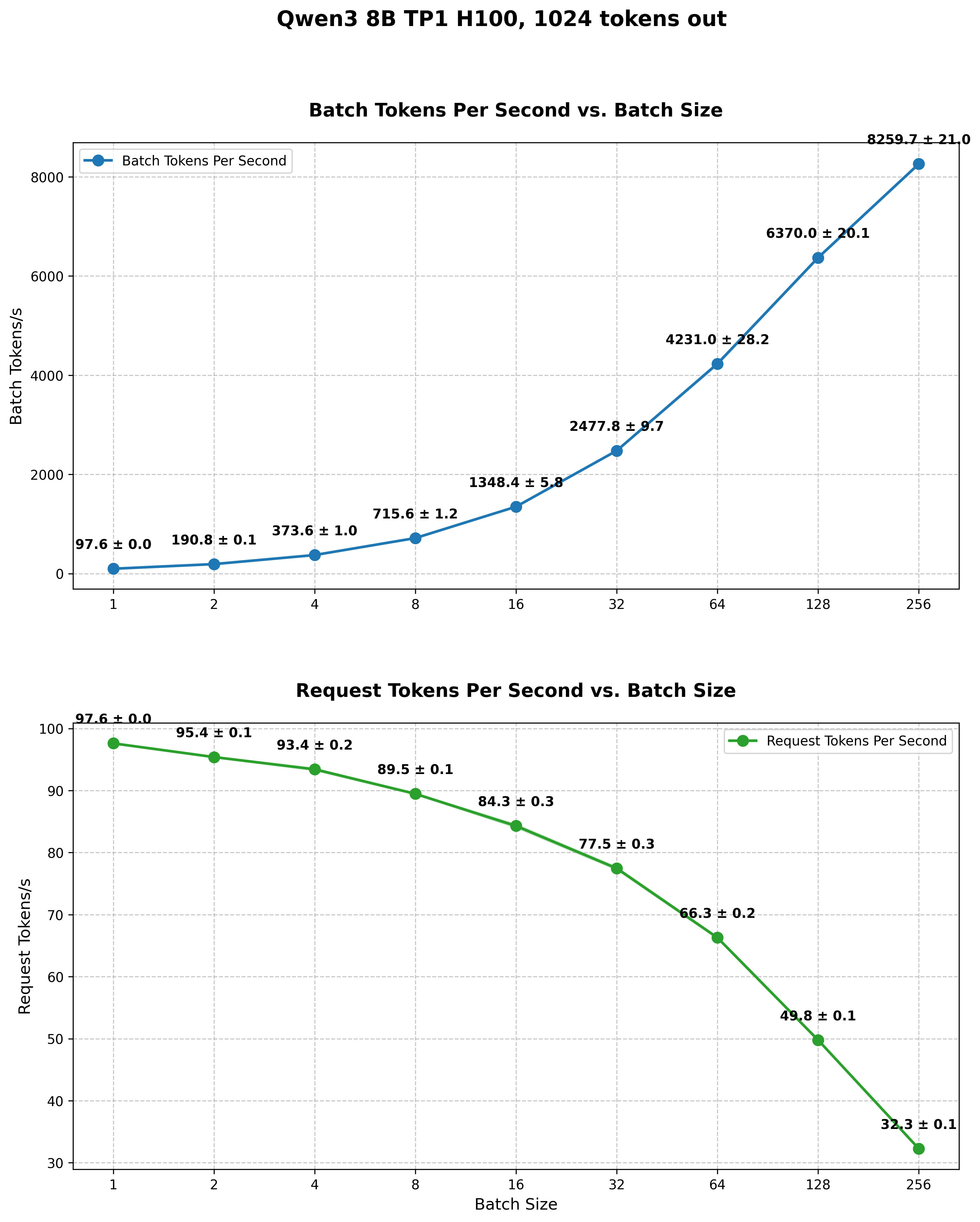 This contrasts sharply with autoregressive token generation. Here, because our computation is primarily memory rather than compute bound, increasing the batch yields substantial throughput gains. As Figure 9 shows, batch size increases correspond to significant improvements in overall throughput across all requests. The latency penalty for individual users is far less severe than with embeddings.