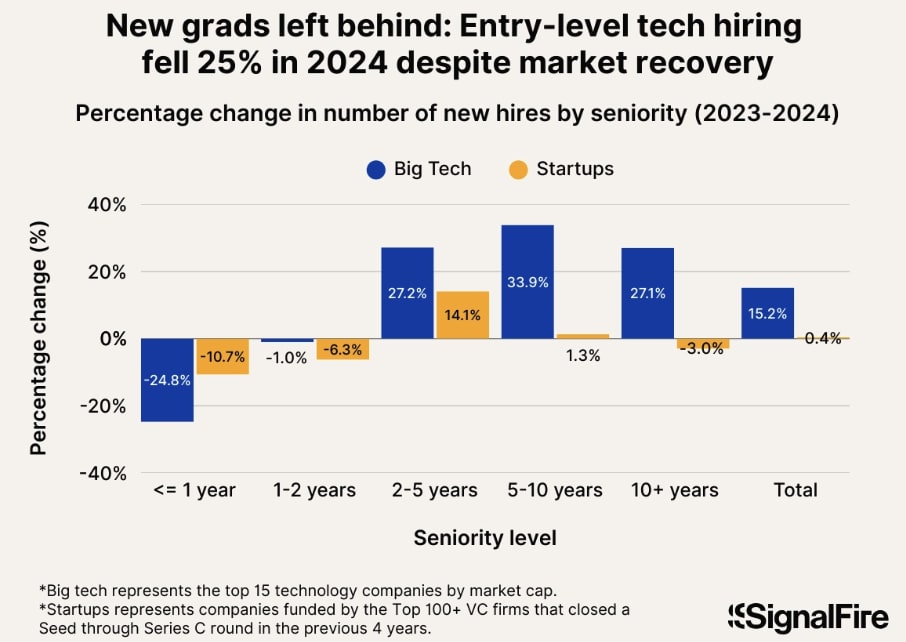 The decline started going down years before generative AI became thing. The narrative of AI taking jobs, while perhaps true, is certainly not all that’s going on. There is also a lot of evidence the AI taking jobs narrative just isn’t determinative, such as the fact that hiring in tech is now up.