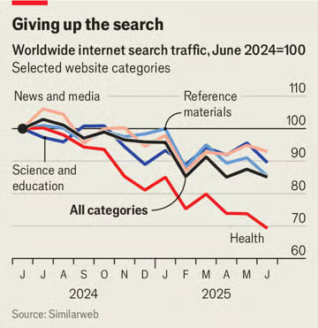 Many industries are undergoing similar predatory shifts, but with AI as an excuse. There’s an attempt to consolidate home buying, with several would-be monopolists trying to knock out realtors from the market, with AI as the excuse. There’s also this observation, from the Economist, on the death blow to publishers: Google is absorbing the web into its AI Now search feature that summarizes webpages.