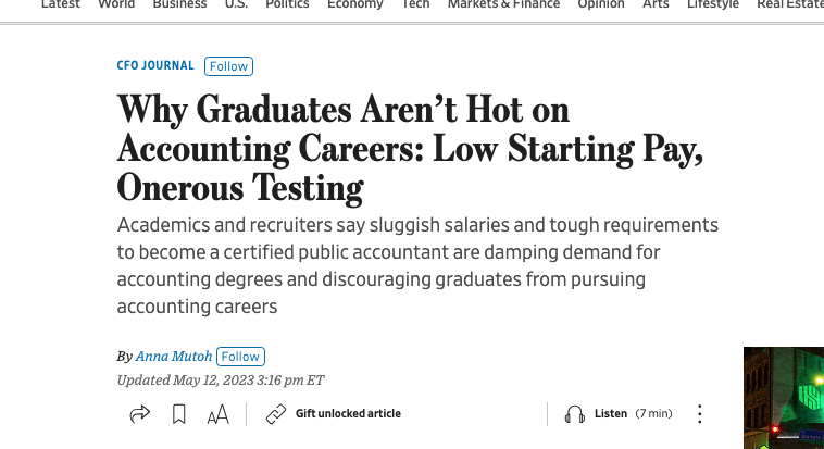 There’s more. If you look at jobs that are supposedly going to be replaced by AI, like accounting, you’ll see that years ago, before AI hit, there was already significant pressure. The reason had nothing to do with AI. Salaries suck, workload is high, and the prestige of the profession has declined as accountants have less power to stand up to the dishonest corporate leaders they are supposed to audit. These are preexisting political problems.