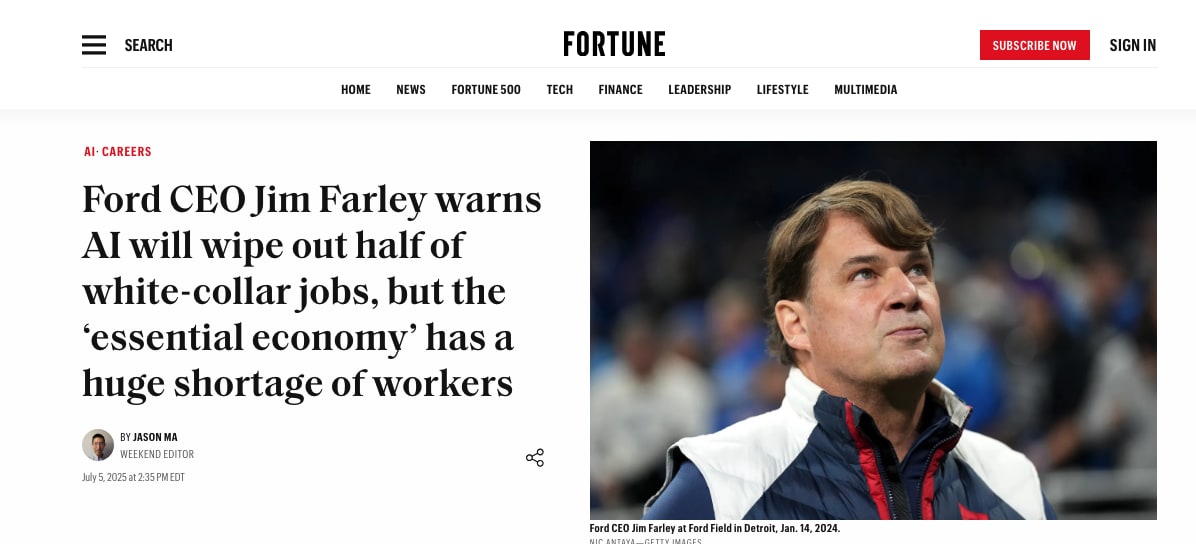 It’s not just Cramer. Amazon, JP Morgan, and Ford are all predicting the jobs apocalypse. Anthropic CEO Dario Amodei, whose company has absorbed a bunch of ex-Biden staff, says one scenario is that most entry-level white collar jobs disappear. "Cancer is cured, the economy grows at 10% a year, the budget is balanced,” he said, “and 20% of people don't have jobs." Here’s Ford CEO Jim Farley saying we need to prepare, and do more training of blue collar machine shop workers, people who move and fix what he calls the “essential economy.”