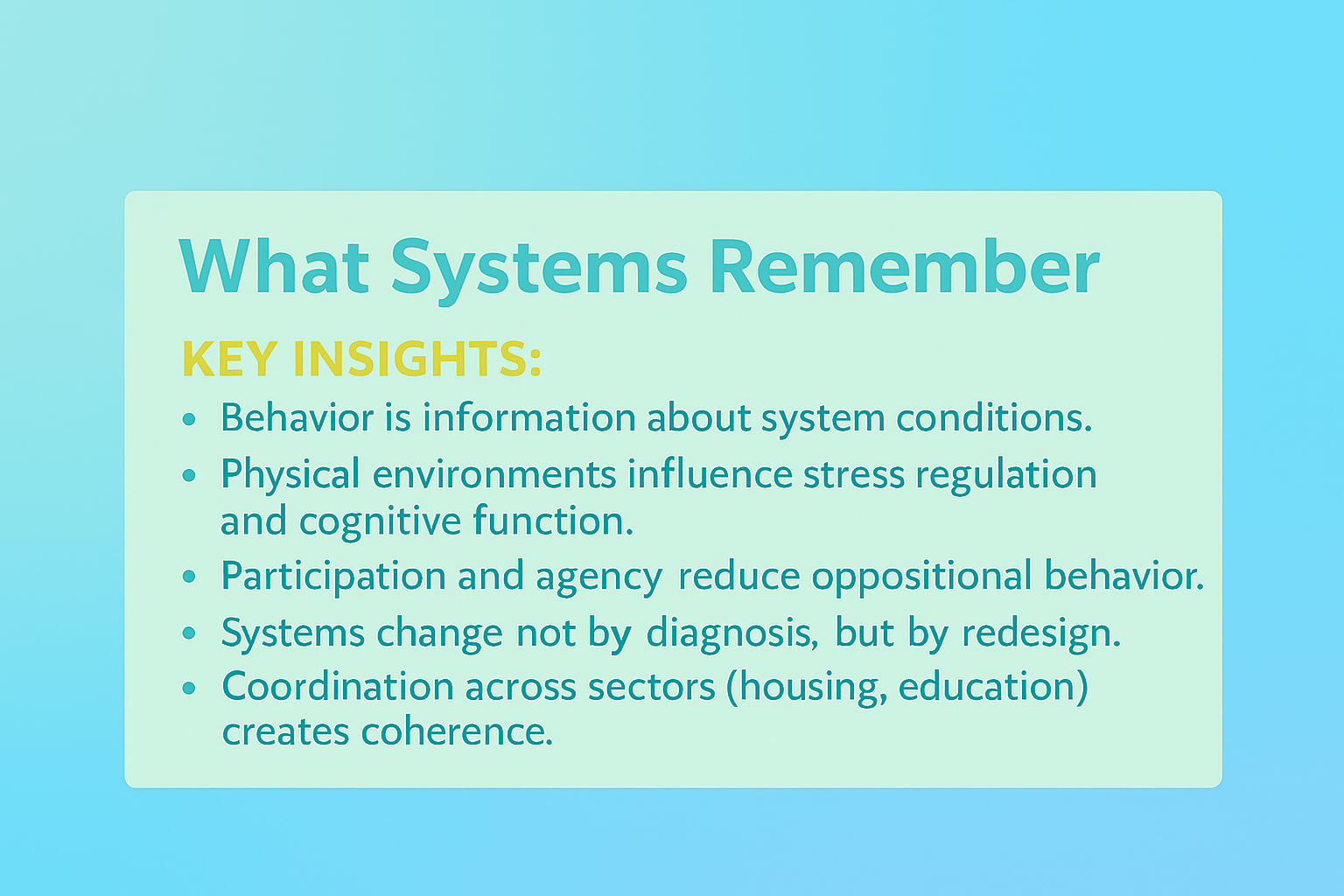 These findings aren’t just theoretical. They have clear implications for how we design classrooms, public spaces, support systems, and policies. So, the following isn’t another trite argument for more empathy, but a broader call for better systems thinking. Specifically, what follows is a synthesis of recent research, policy, and community practice, showing how behavior reflects what systems make familiar.