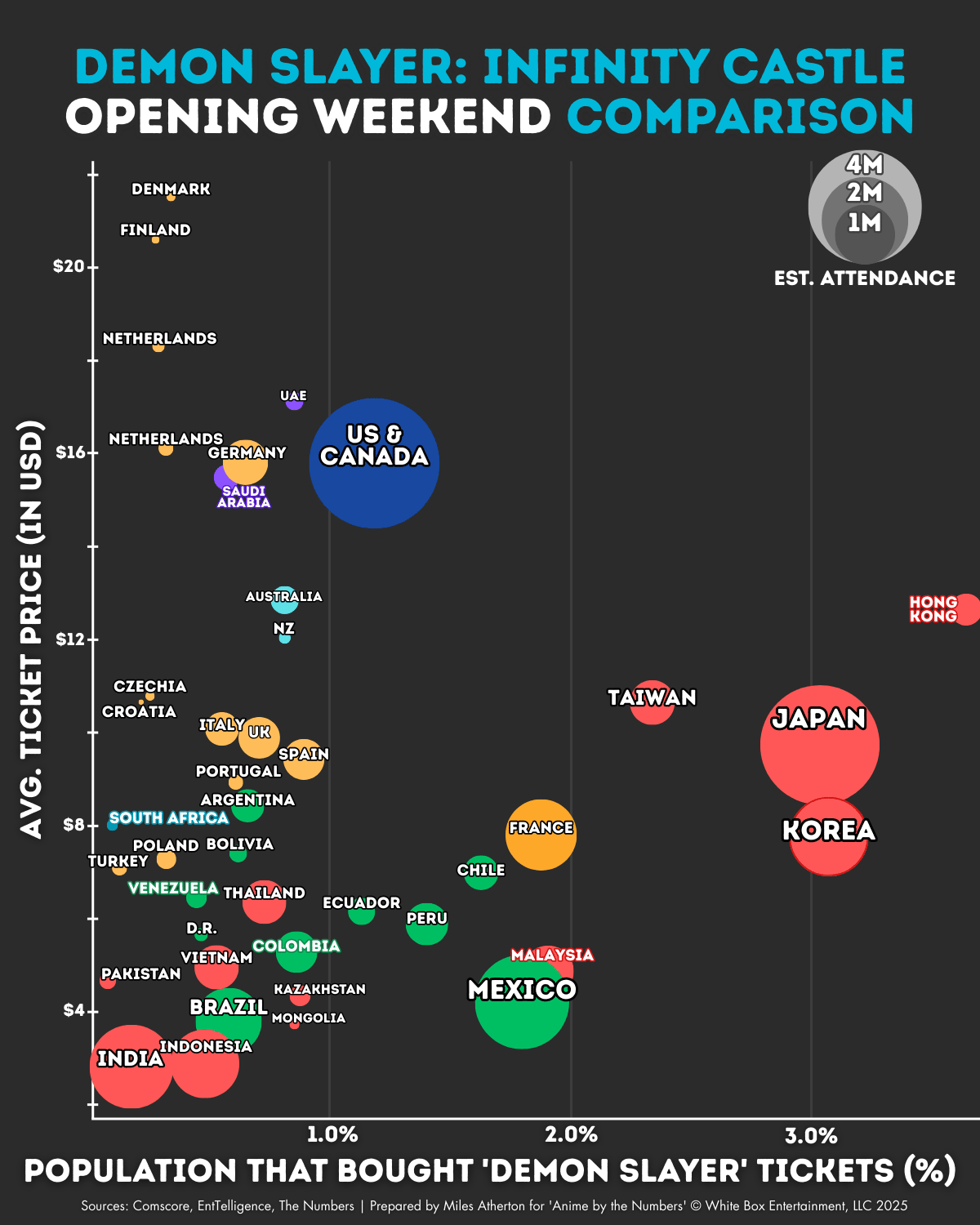 In our previous issue, I took over our Chart of the Week section to share a country-by-country comparison of the new Demon Slayer film’s opening weekends around the world. While I was pleasantly surprised to see how much the chart resonated with folks, there were two major pieces of feedback that I took to heart: 1) I included France too early (the data only included preview night), and 2) the PPP-adjusted ticket prices were not considered helpful.