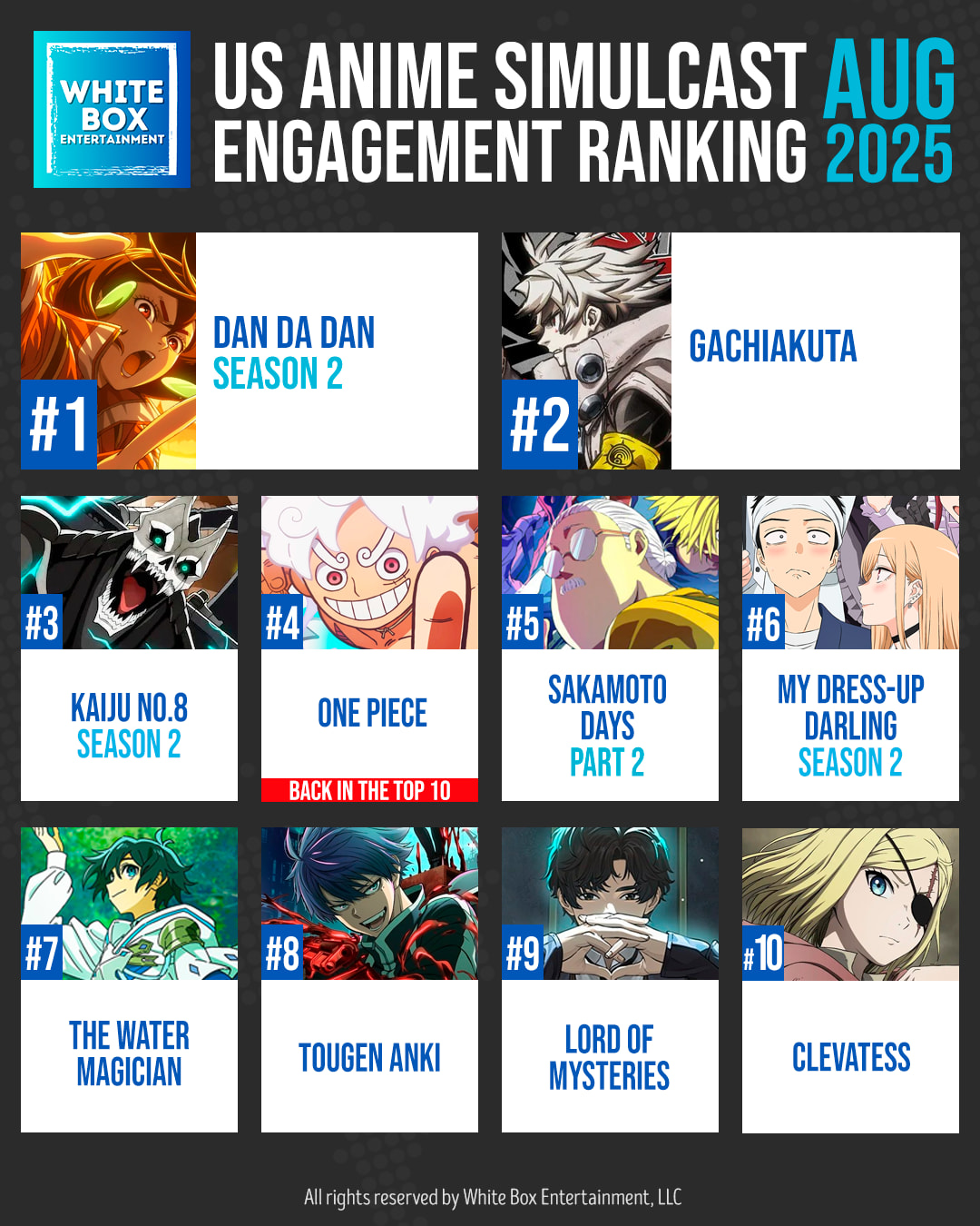 But first: our simulcast ranking of August’s titles now that we’ve presented them to clients, an update of last issue’s Demon Slayer: Infinity Castle chart, and more… - Klaudia A.