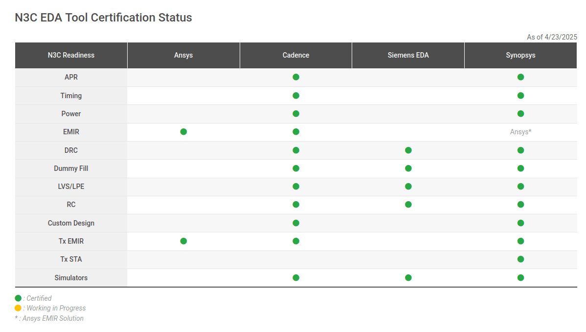 TSMC is probably the most important fab in the world. The most valuable chips, from Apple’s M4 CPUs to NVidia B200 GPUs, are made in their foundries in Taiwan. And TSMC maintains close relationships with a small number of EDA vendors, dubbed the “EDA Alliance”. Some of these vendors have their tools officially certified to work with TSMC processes. For example, here are the certifications for TSMC’s 3nm process: