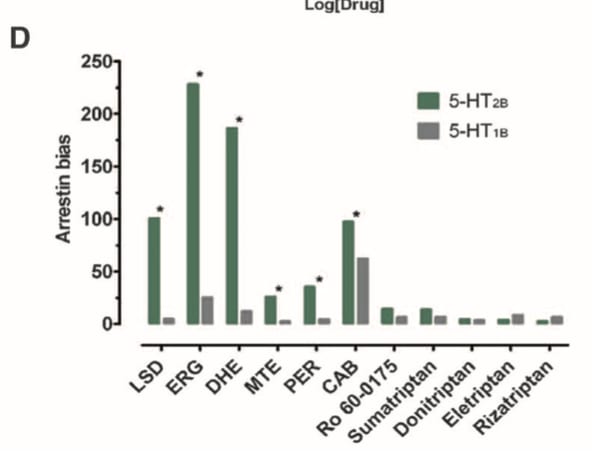 This figure shows the “arrestin bias” (how much the molecule activates the beta-arrestin pathway over the Gq pathway) for a number of molecules, including LSD, at the 5HT2B receptor (related to the 5HT2A receptor).