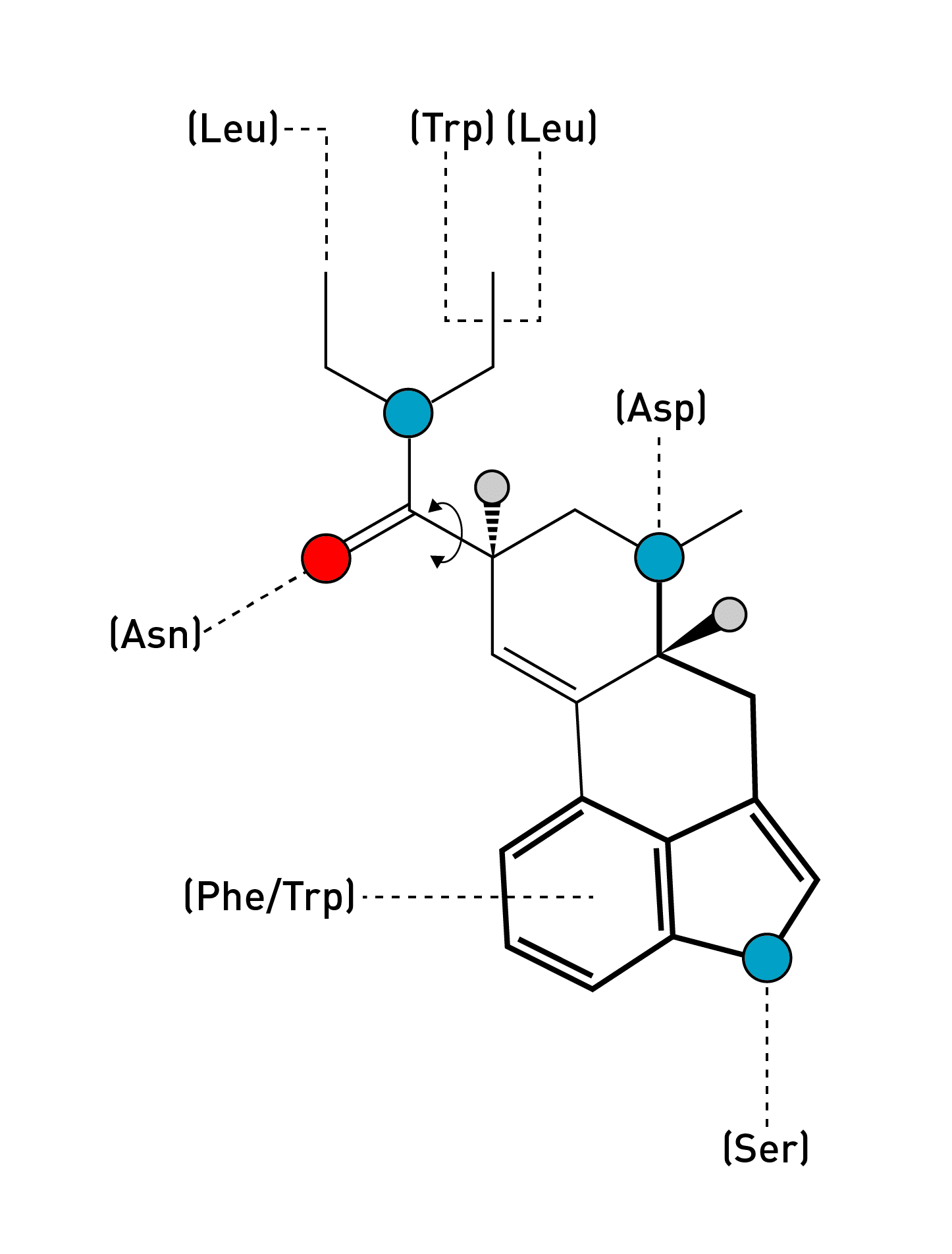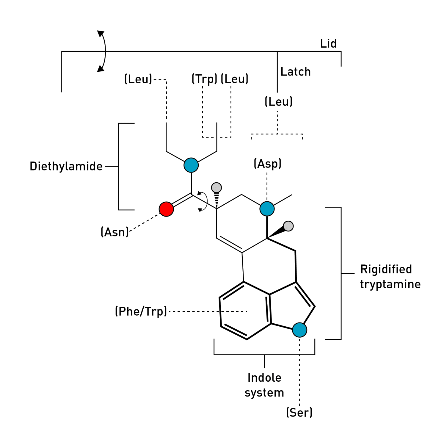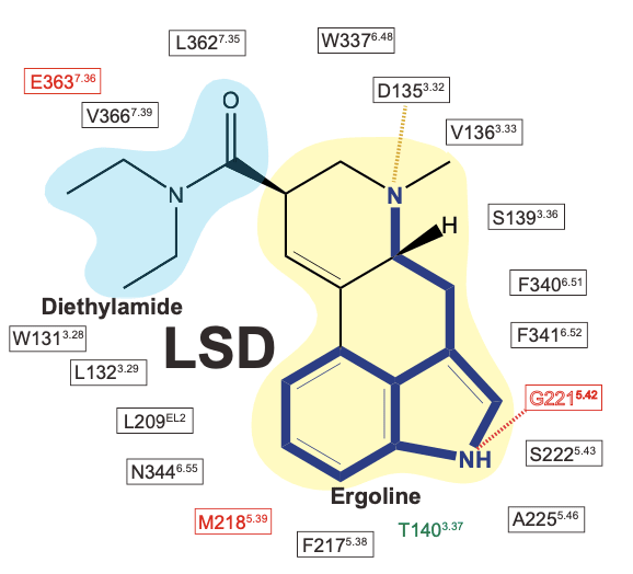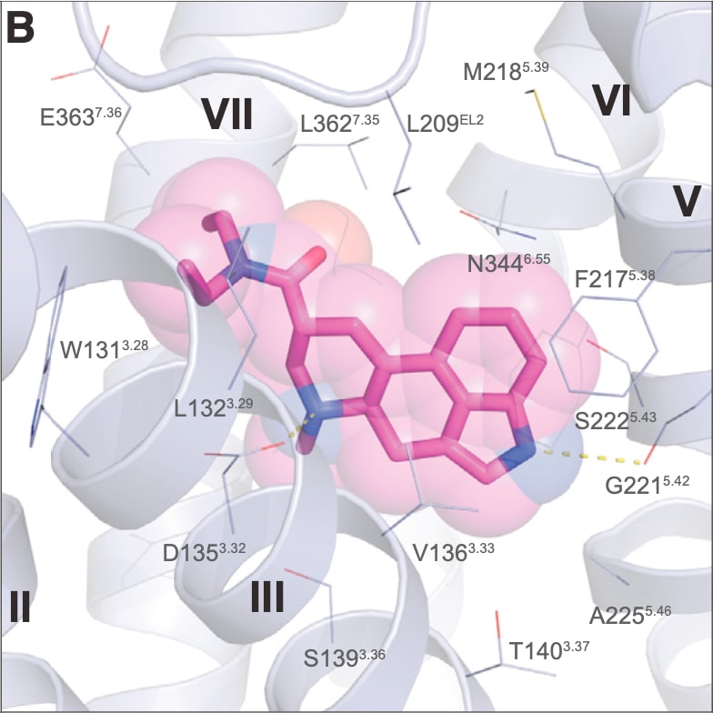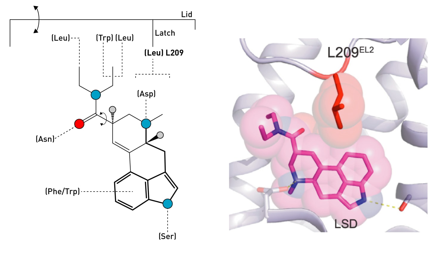 Remarkably, LSD seems to have found the optimal way to rigidify the tryptamine side chain to achieve an almost perfect match with the crucial amino acids in the ligand binding site: As the indole ring slides into position, guided by the flat electron-rich rings of phenylalanine (Phe) and tryptophan (Trp) within the receptor binding site, the indole nitrogen forms a hydrogen bound with a well-placed serine (Ser), and the side chain amine becomes perfectly positioned to interact with a critical aspartate (Asp).