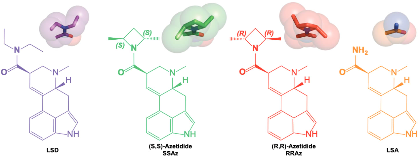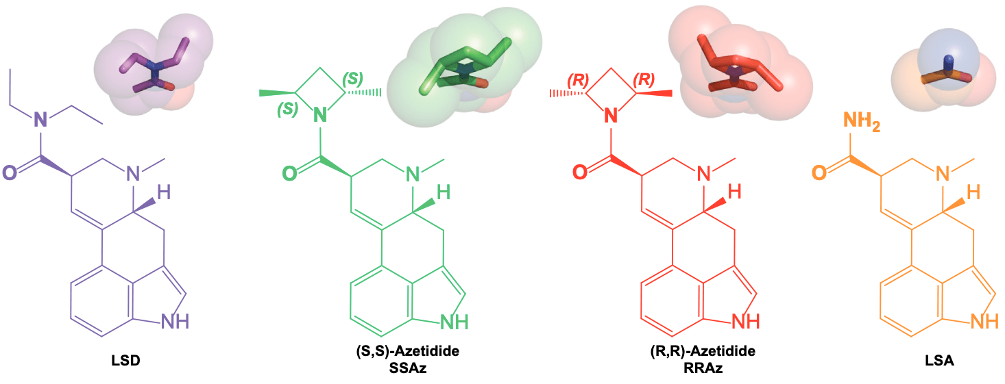 (S,S)-Azetidide (SSAz) most closely resembles the ‘pink’ conformation of LSD, whereas (R,R)-Azetidide (RRAz) resembles the ‘yellow’ conformation. Since LSD adopts the ‘pink’ conformation in the receptor binding site, they predicted that SSAz ought to be a more potent activator of the 5HT2A receptor than RRAz (which would be unable to form the required interactions in the binding site). Interestingly, they found that both SSAz and RRAz were almost equally potent in activating the Gq signalling pathway, whilst RRAz was much weaker in activating the beta-arrestin pathway. This suggests the ‘pink’ conformation of the diethyl groups is important in eliciting the particular pattern of signalling that engenders the psychedelic effect. LSA, which doesn’t contain the ethyl groups at all, was even less potent at activating beta-arrestin signalling. Overall, this demonstrates the importance of these two ethyl groups in the unusual potency of the LSD molecule.