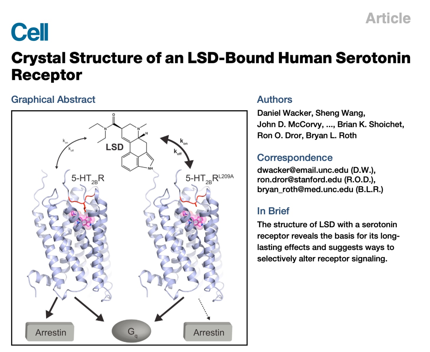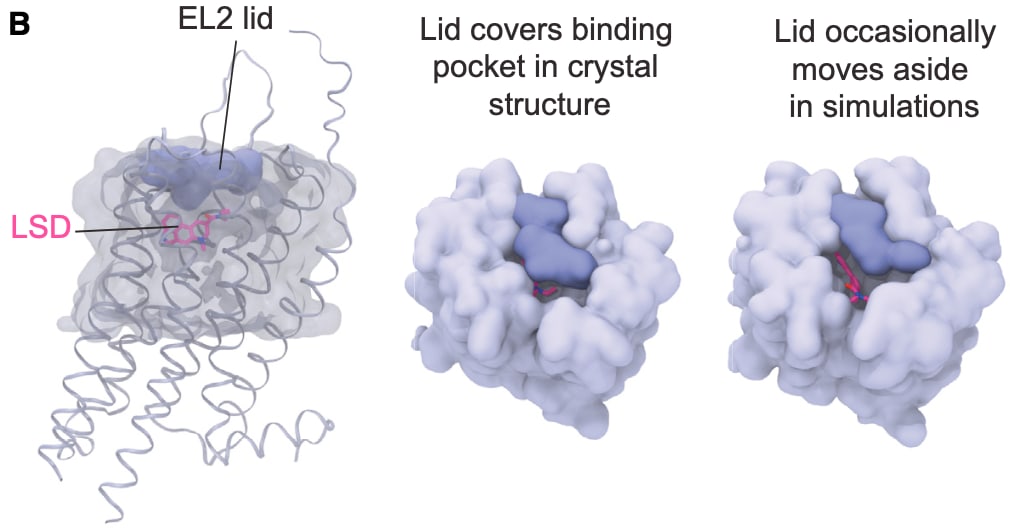 LSD has an extremely long residence time, owing to a portion of the receptor (the authors refer to this as a ‘lid’) that folds over the LSD molecule and is locked shut by a unique latch mechanism.