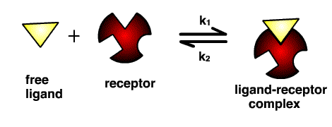 Molecules don’t bind to a receptor and then simply sit there permanently, except in the rare case that the molecule can form a strong covalent bond with the receptor (the lethal nerve agent VX, for example, forms a covalent bond in the binding site of the enzyme acetylcholinesterase). They bind and unbind to the receptor at different rates, known as the ‘on’ (k1) and ‘off’ (k2) rates, depending on their interactions with the receptor. This can be formalised as an equilibrium: