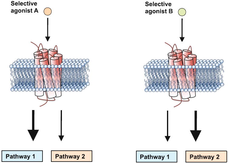 The particular pattern of Gq and beta-arrestin signalling will depend upon the active conformation that the receptor adopts, which can be controlled by the binding of different molecules. Crucially, when LSD binds to the 5HT2A receptor, it activates a particular balance of both Gq and beta-arrestin signalling. Different molecules, depending on their molecular structure, will elicit different patterns of signalling that may or may not induce psychedelic effects — this is known as signalling bias (or functional selectivity). Serotonin, which is not psychedelic, is known as a balanced agonist, since it doesn’t favour activation of the Gq pathway over the beta-arrestin pathway, whereas the classic psychedelics are biased agonists, since they favour one pathway over the other (by shifting the receptor into distinct conformations when they bind).