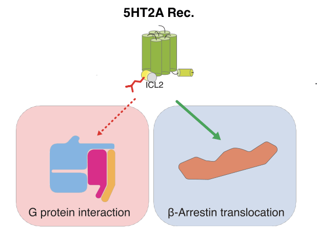 However, the 5HT2A receptor can also interact with a different signalling pathway — the beta-arrestin pathway — which has also been shown to be important in generating psychedelic effects (LINK). Although the precise mechanism of this remains unclear, the arrestins are known to be important structural scaffolds for assemblies of signalling proteins, so they might have a role in organising signalling through the neuron’s interior.