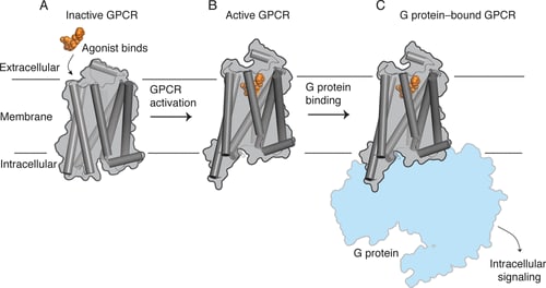 Receptors are flexible proteins that shift between conformational states. In the simplest case, a receptor will have an inactive conformation that doesn’t interact with intracellular signalling proteins and is thus “silent” and an active conformation that’s able to bind to these signalling proteins and activate the pathways that elicit the effects on the neuron’s function. The 5HT2A receptor, for example, interacts with a signalling protein called Gq (from a family of signalling proteins known as the G-proteins — hence the 5HT2A receptor is known as a G-protein coupled receptor, GPCR), which ultimately leads to depolarisation of the neuron (makes it more excitable and likely to fire). This is partly what engenders the psychedelic effect at the cortical level.