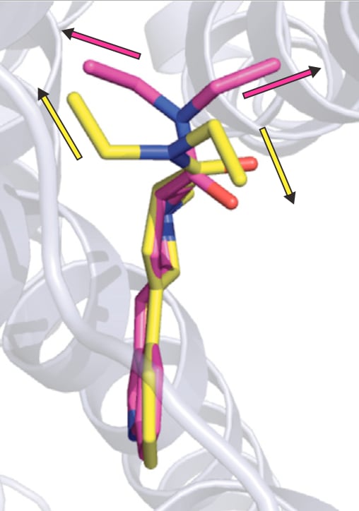 This is easier to visualise than to explain: In the diagram below from the paper, the two conformations of LSD are overlaid in yellow and pink. Notice how the ethyl groups in the yellow molecule point away from each other and in the opposite directions to those of the pink molecule. These are the two rotational conformations of LSD.