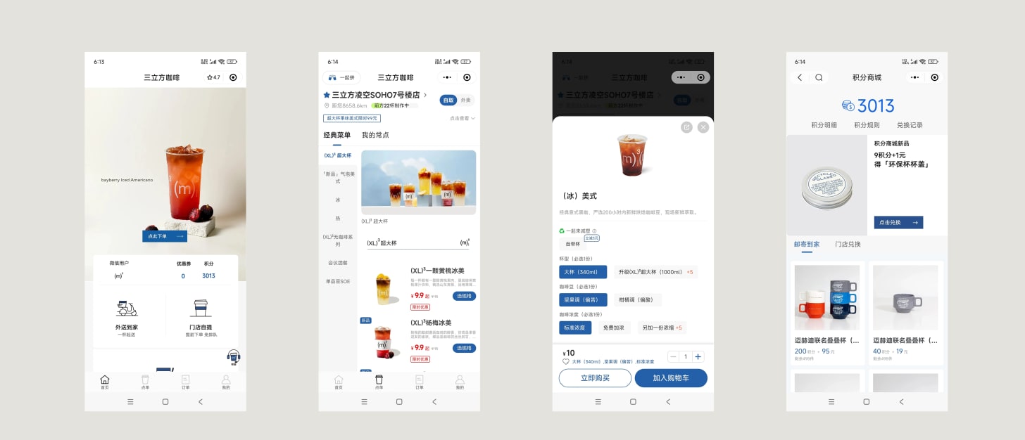 The mini-program of many new coffee brands in China (三立方): White space, limited use of colors, etc.