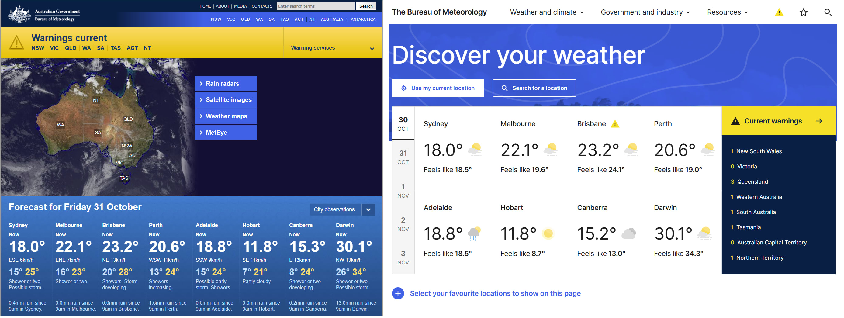 Users like things that are familiar. And someone looking at one weather site is probably looking at others. So if you look across the industry at sites like weather.com, https://www.metoffice.gov.uk, and weather.gov you see a consistent pattern that is data rich and forecast text heavy. All of the above immediately show a map, and if possible a local forecast overview that describes specific events. Users Expections are for a site that is information dense, which is exactly what the old BOM website was - and is the exact opposite of what the BOM website is now.
