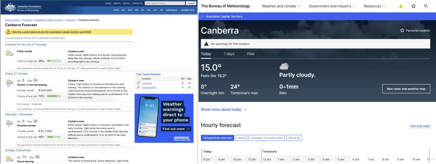 It’s inarguable that the new website looks nice, it’s clean it has adequate whitespace and is super readable. A design agency would have prepared the final design and said this aligns with industry best practice, the BOM Head of Marketing would have agreed, and the associated teams would have agreed. They would have said that the large chunky text was easy to click, and the daily weather graphics were clean and reduced the text, and removing menus reduced the amount of clicks people needed to make. A room full of designers would agree it is “user-friendly” and proudly sign-off on the launch.