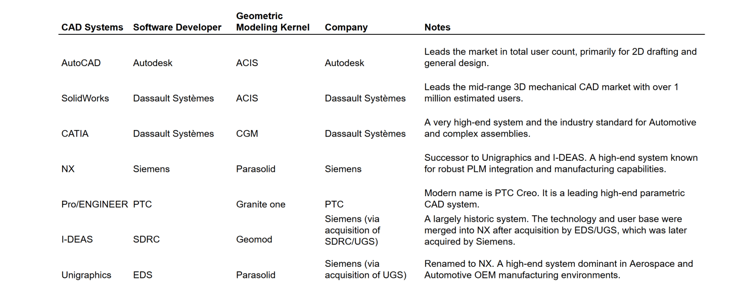 Today, virtually all commercial CAD systems are built on a small handful of proprietary kernels monopolized by four companies.