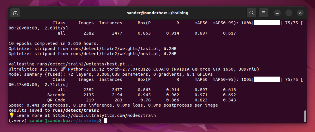 Running on a GTX 1650 roughly took 2.5 hours to finish. For comparison, the same training takes only 27 minutes on an RTX 4070: