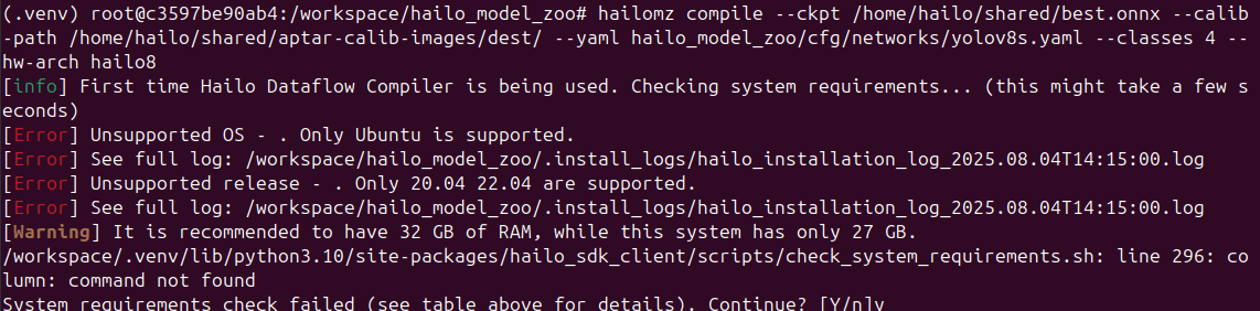 hailomz compile --ckpt ../../training/runs/detect/train2/weights/best.onnx --calib-path ../../training/train/images/ --yaml hailo_model_zoo/cfg/networks/yolov8s.yaml --classes 2 --hw-arch hailo8In the first time, the compiler does not recognize Ubuntu:
