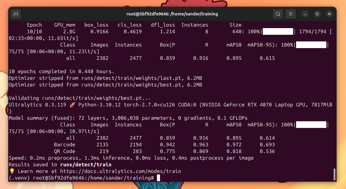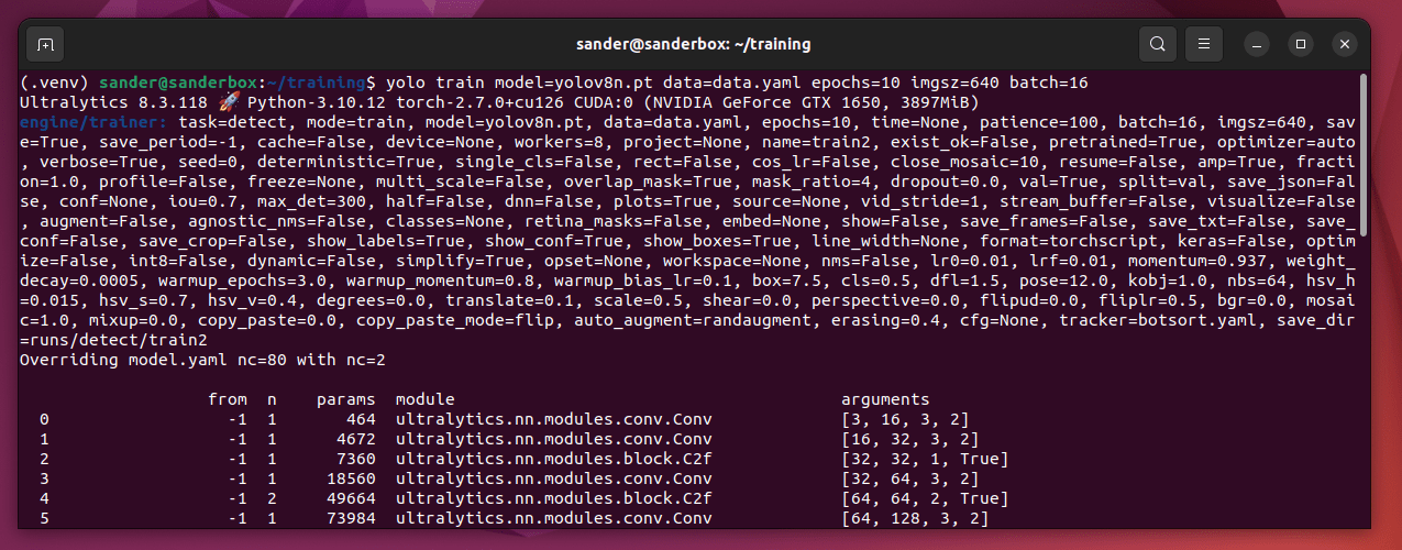 yolo train model=yolov8n.pt data=data.yaml epochs=10 imgsz=640 batch=16The training starts, and this is probably what you are seeing: