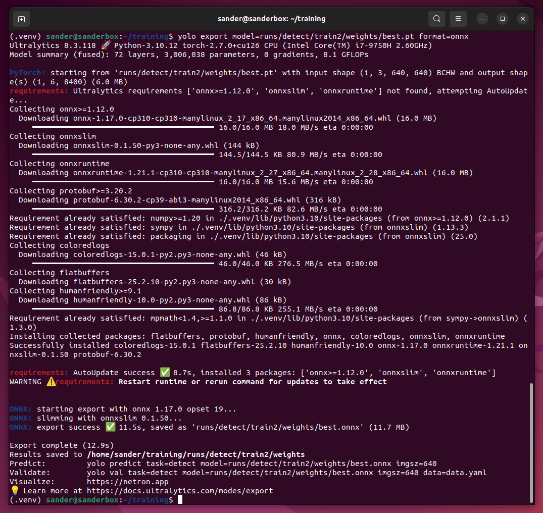 yolo export model=runs/detect/train2/weights/best.pt format=onnxNow, we have the best.onnx file. It is time to use the Hailo software to convert it to HEF format in the next step.