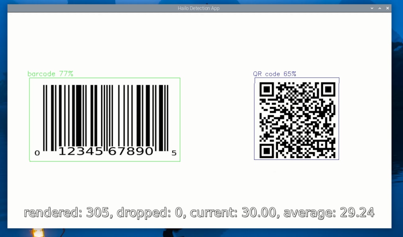 python basic_pipelines/detection.py --labels-json barcode.json --hef-path /home/impuser/Documents/yolov8s_barcode.hef --input /home/impuser/Documents/barcode_qrcode.mp4 -fIf everything is ok, the video starts as shown below: