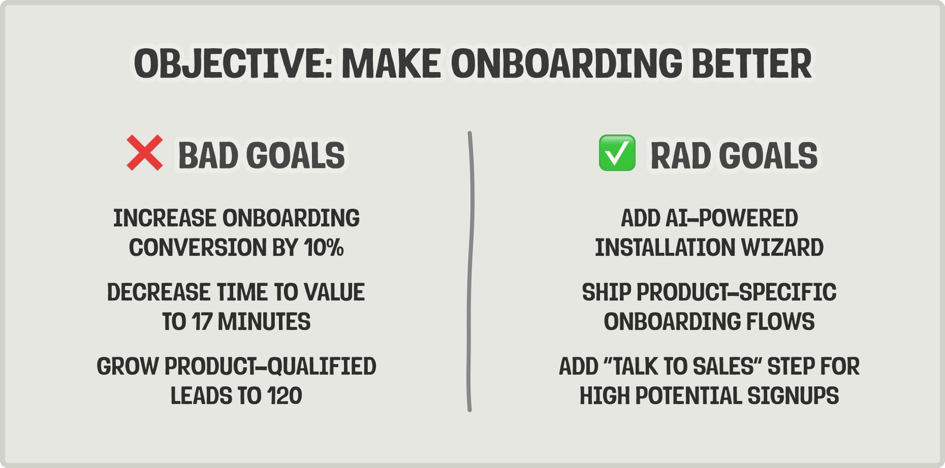 This type of goal better aligns with our overall goal of shipping a great product that equips every developer to build successful products, not just making a number on a graph go up.
