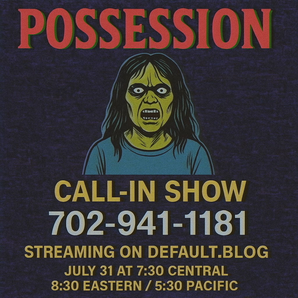 We’re streaming at 7:30 Central — that’s 8:30 Eastern and 5:30 Pacific. Our call-in topic is POSSESSION. As always, you’re free to interpret that however you like. Literal demonic possession. Possessing a lover. The movie. Stealing shit. Whatever it is, I’m open. Tune in here, on Twitch, X, YouTube, TikTok, or Instagram. You can watch our unedited backlog here.