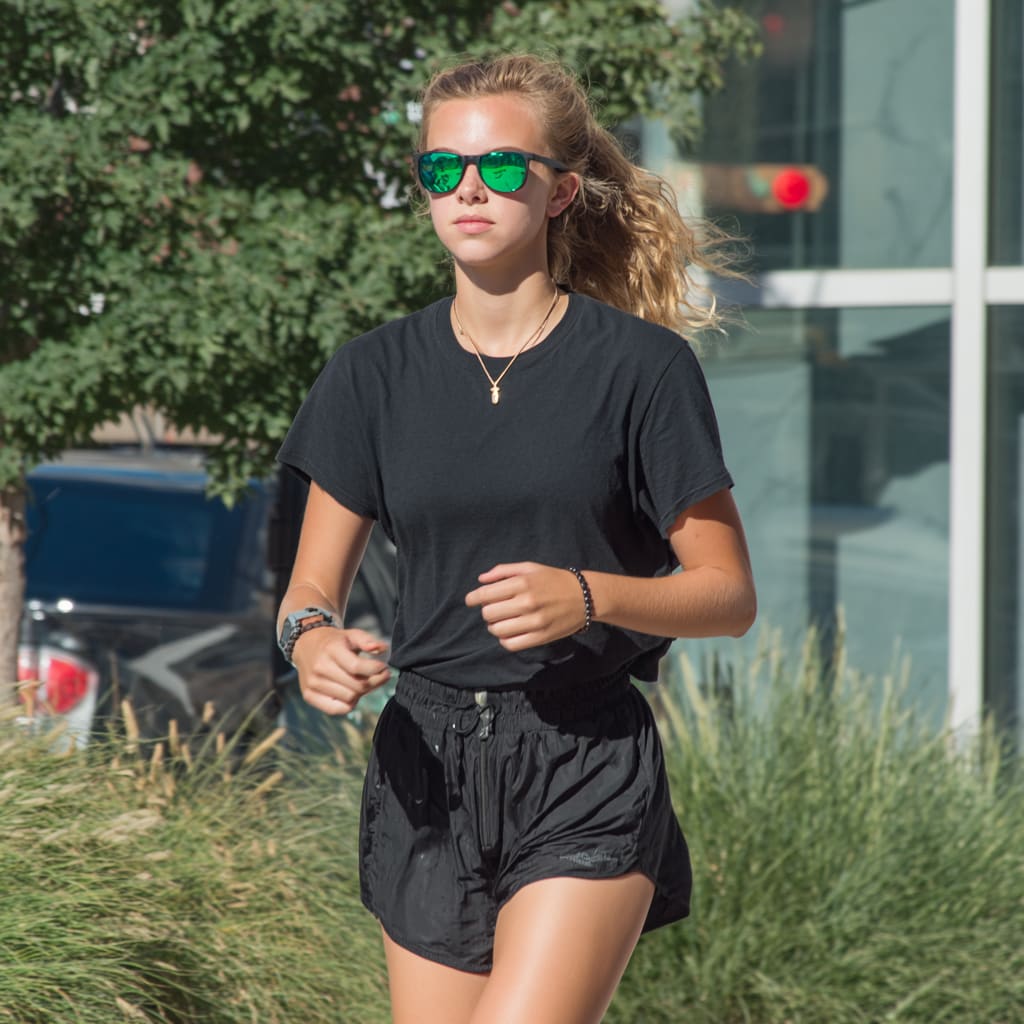 Dressed in all black, she had the typical running gear, the split shorts and the technical t-shirt and the propulsive-looking shoes. But over her eyes she had wraparound sunglasses, in a vibrant tint of green, as she ran along the promenade.