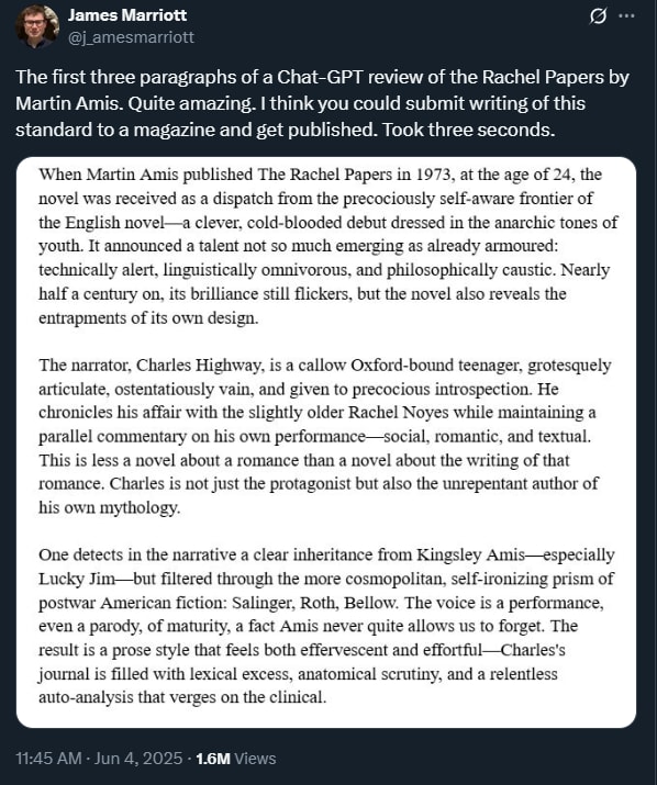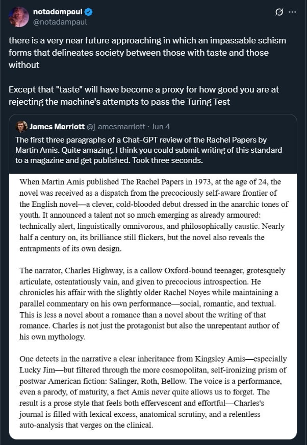 I feel a bit bad dunking here, as I can see how, if this were near enough to your first time reading such effervescent and effortful prose from the machine, it could seem initially very convincing. But, quite frankly, if you are presenting yourself as a purveyor of literary taste, I have little sympathy. You are just straight up wrong, and if this is publication-worthy then so much the worse for the publication, because my taste remains intact.