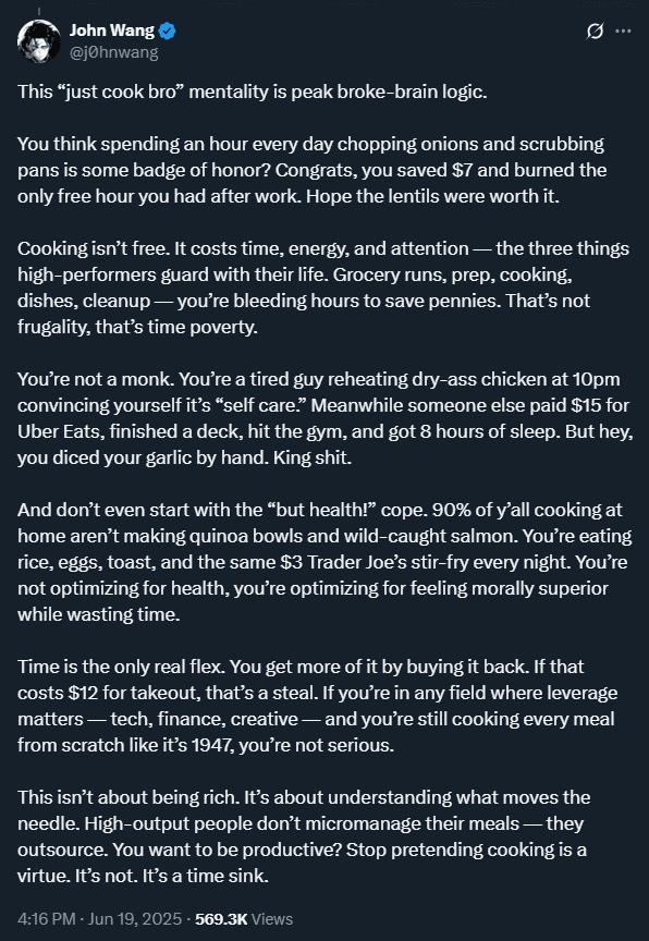 “Stop pretending cooking is a virtue. It’s not. It’s a time sink.”